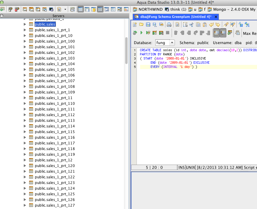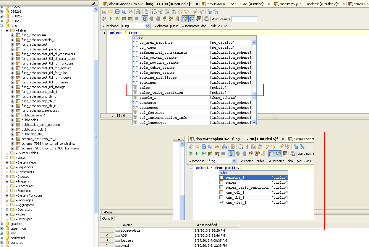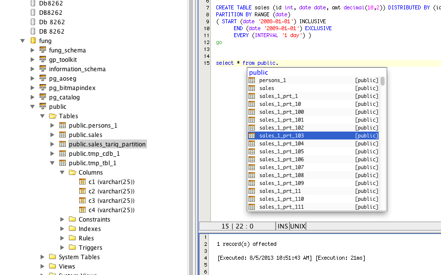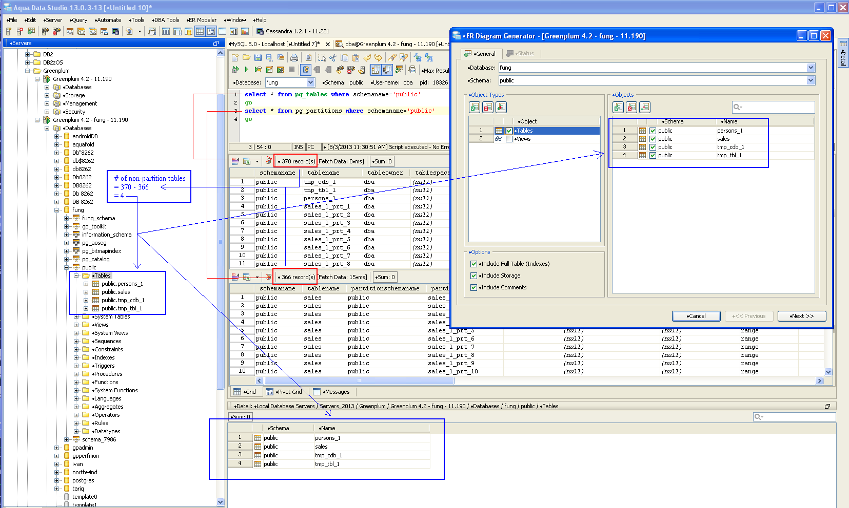 When viewing objects in a greenplum database, partitions and subpartitions of tables appear as separate table objects - it would be extremely useful if Aqua Studio would recognize this and group partitions and subpartitions underneath the base table with the ability to expand to the partition level if required.