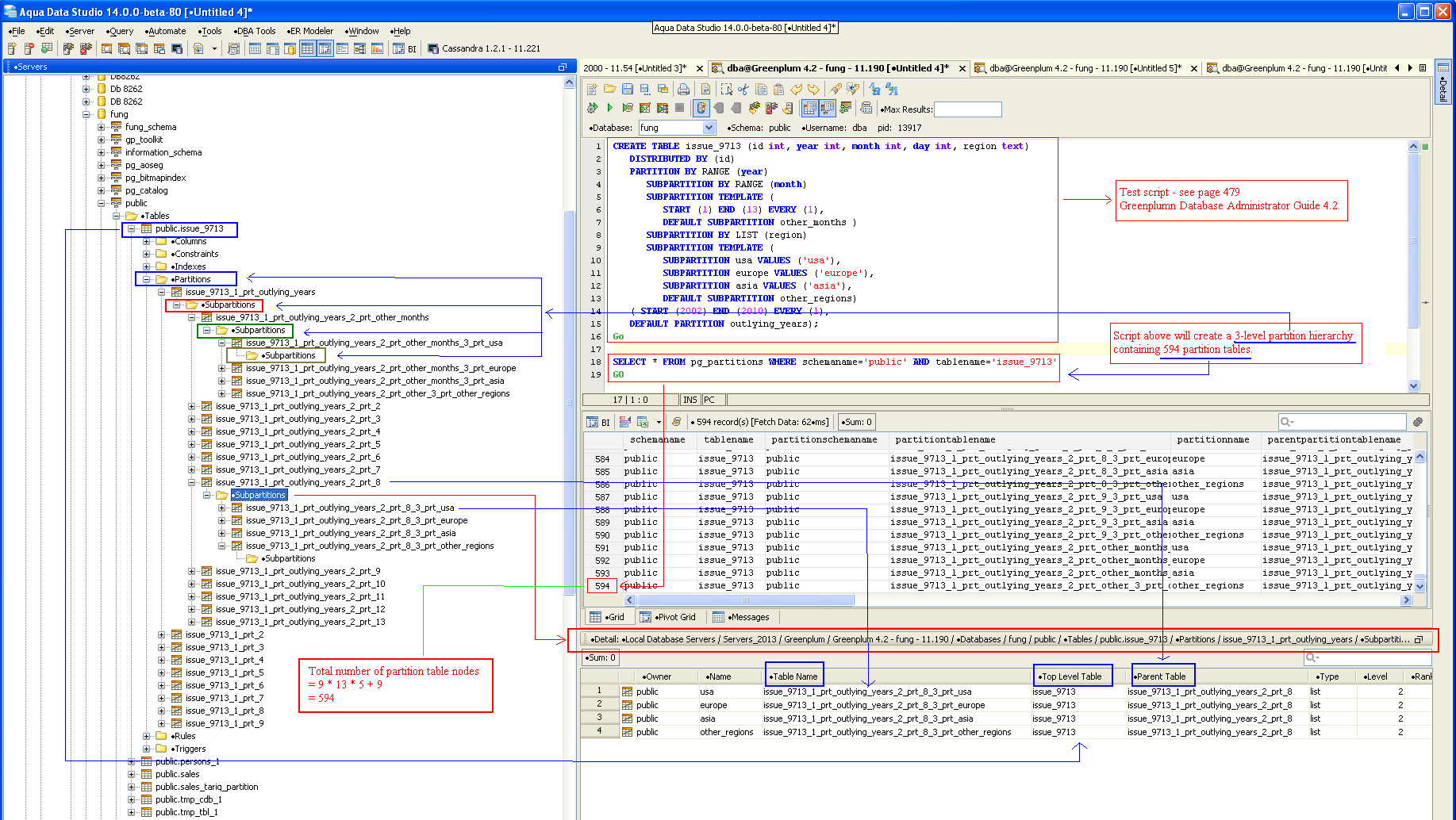 The CREATE TABLE script below is described in the Greenplumn Database Administrator Guide 4.2, page 479. This script will create a 3-level partition hierarchy containing 594 partition tables. This fix uses this example script to verify its correctness. In ADS, you can use the information displayed in Partitions/Subpartitions nodes' detail view to verify the relationships among created partition tables. See GreenplumPartitions screenshot for details.