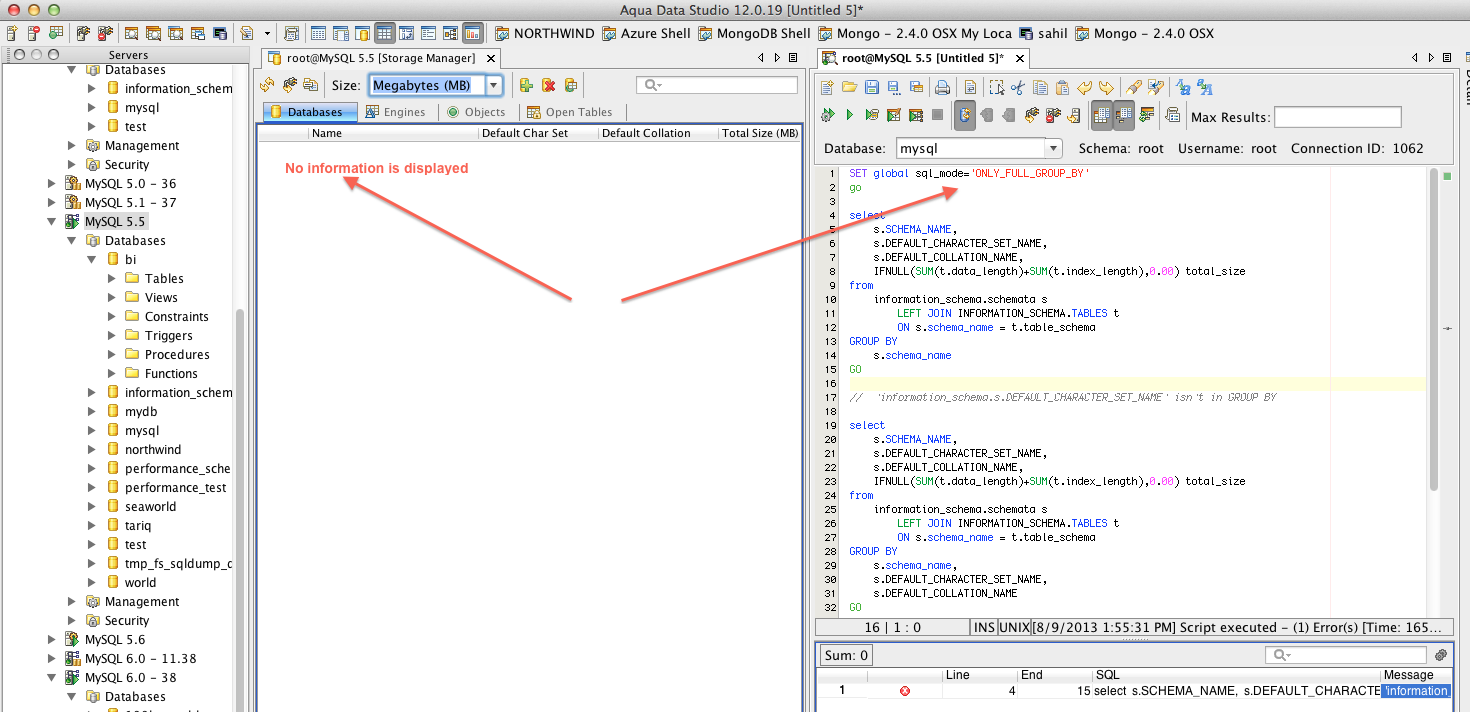 // 'information_schema.s.DEFAULT_CHARACTER_SET_NAME' isn't in GROUP BY