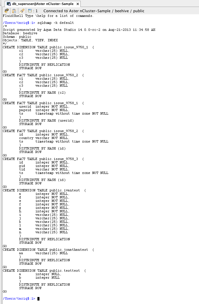Fluid commands such as \sqldump, \sqlimport, \sqlexport, etc. take a "-s (or --schema) SCHEMA_NAME" option to locate the database object(s) from the server. If -s option is not specified, these commands will consult ConnectionProperties.getCurrentSchema( ) to get the current schema as the default schema name. The root cause of this issue is ConnectionProperties.getCurrentSchema( ) returns the login username as the current schema name for nCluster, and, the login username is not a real schema name and hence no database objects are retrieved from the server. For the time being, the only way to get \sqldump work for nCluster is to run \sqldump with -s option or -S (capital S for all schemas) specified: for example - '\sqldump -s public' or '\sqldump -S' (capital S for all schemas). This scenario applies to all of fluid commands that take -s/--schema option, e.g. \sqlexport, \sqlimport.