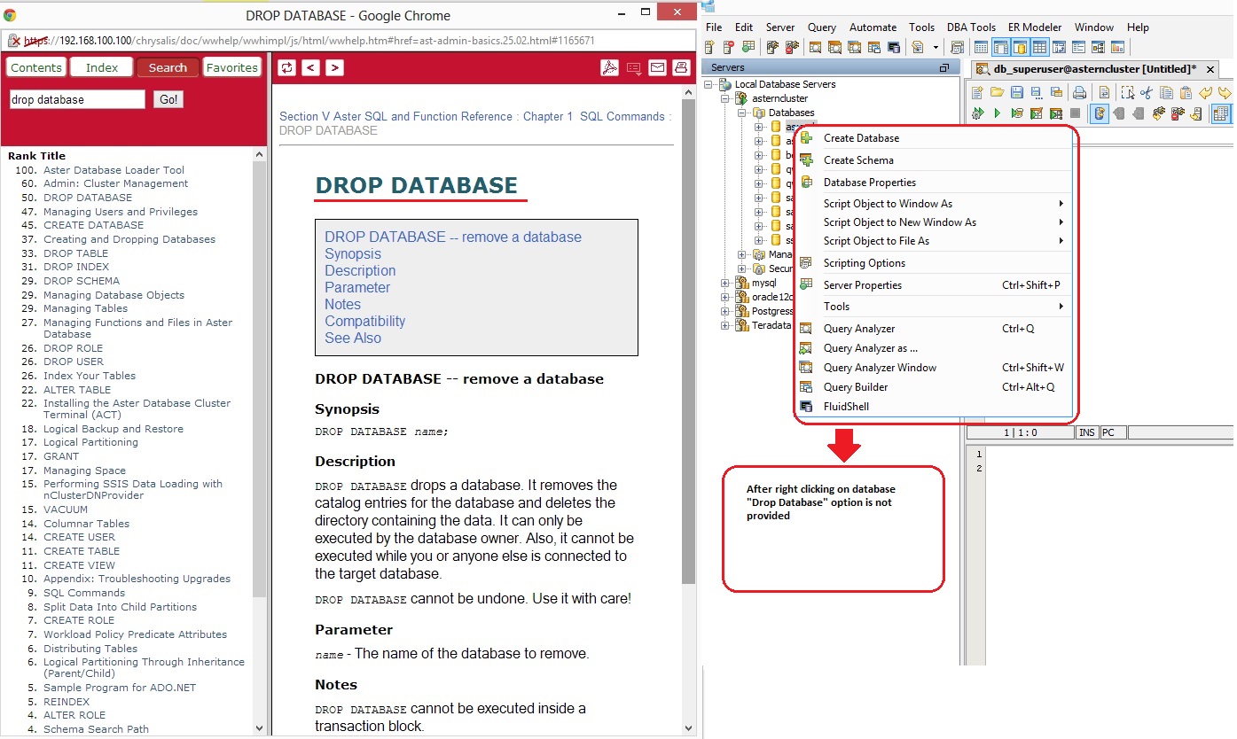 We don't offer Drop Database in nCluster and other postgresql variant DBs b/c of the 1 conn per DB limit. You are not allowed to drop a database if you have a currently open connection to that DB. By using the schema browser, the app has already created a conn to that DB. Hence, it is not possible to drop a DB via Schema Browser. This is why we don't provide the Drop DB option.