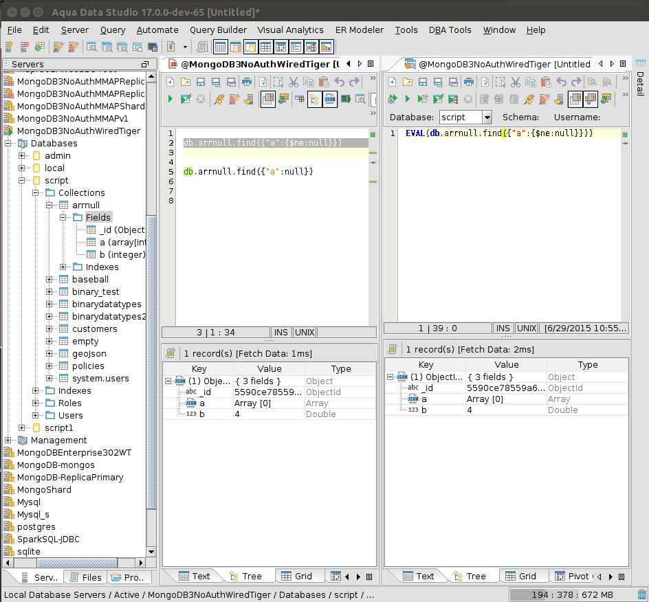 db.arrnull.count({$and:[ { "a" : { "$exists" : true, $not:{$type:10} } }]})3)select a,b from arrnull where a is null group by a,b--wrong from SQL point of view( see result of count)--a b---- -----[ 1, null ] 1--[ null , 3 ] 2--[ null , null ] 3--(null) 5go