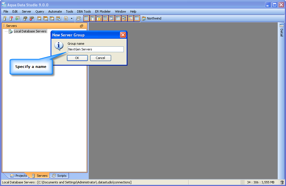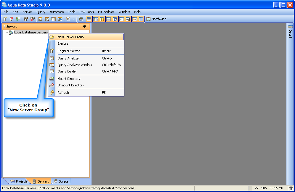 You can now connect to the newly registered Server and perform Data Manipulations. Tip : Using the Keyboard combination "SHIFT + INSERT", you may quickly create a Server Clone. Using Aqua Data Studio to connect to a Server