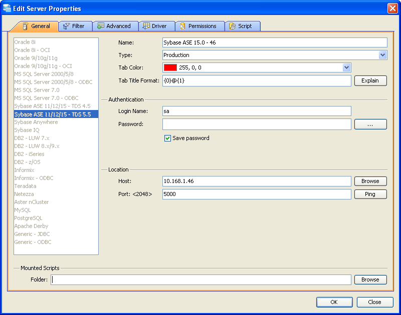 Register Sybase Server - Sybase registrations should be straight forward, although you should make sure your Sybase server has had the Sybase sql_serverXX.sql meta data script applied to it as documented in your Sybase documentation. This script is usually applied during installation by default. Tab Coloring To Identify Server Environments, whether it is a Production, Development or Test, use Tab Coloring feature :