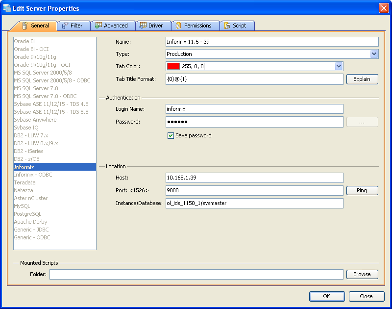 Register Informix Server - Informix registrations should be straight forward. Tab Coloring To Identify Server Environments, whether it is a Production, Development or Test, use Tab Coloring feature :