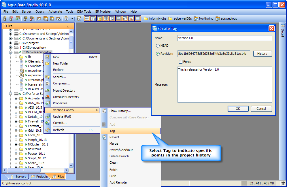 See in the attached picture how I have tagged a commit to version v1.0.0 Cherry Picking using Aqua Data Studio - Apply one commit from one branch to another