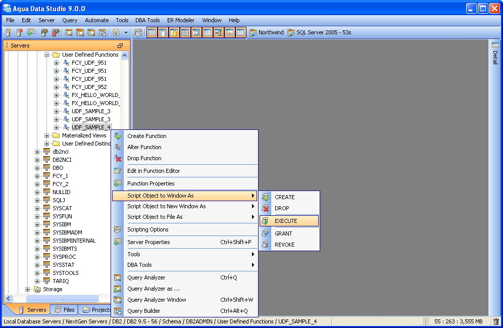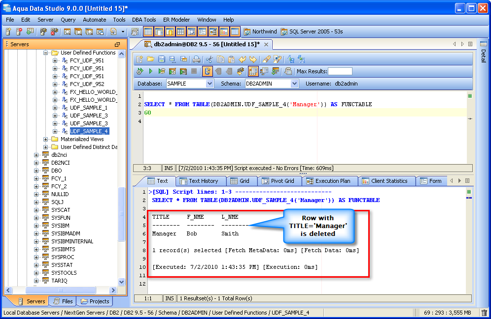 Executing DB2 USER DEFINED FUNCTION Connect to the Database Server and Open a Query Analyzer. Type the following and Execute to see the UDF result