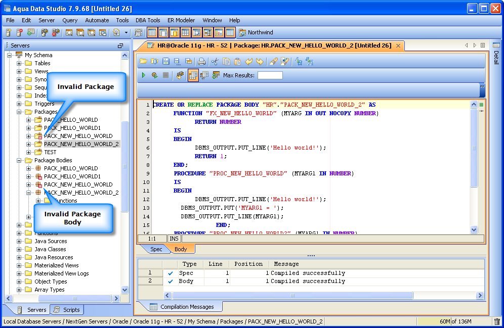 Package Editor Compile - Compiles the package, logs any compilation messages in the result grid below. To jump to the source of a compilation error, double-click on the line in the Compilation Messages grid. Options for determining if both the header and the body are both compiled when compile is executed can be set in File -> Options -> Procedure Editor. Execute Procedure - Displays the Execute Procedure dialog to let the user specify parameters before execution. To set a value, simply click on the parameter’s Value cell and enter a value. To execute, click the Execute button or click the Cancel button to abort execution. The Oracle Package Editor allows users to edit packages more easily by providing both the definition (specification) and the body in one tab window. The editor also provides a drop down of all functions & procedures in the package for quick navigation. When Packages, Functions or Procedures are Invalid, a red invalid indicator appears in the Schema Browser tree over the object's icon.