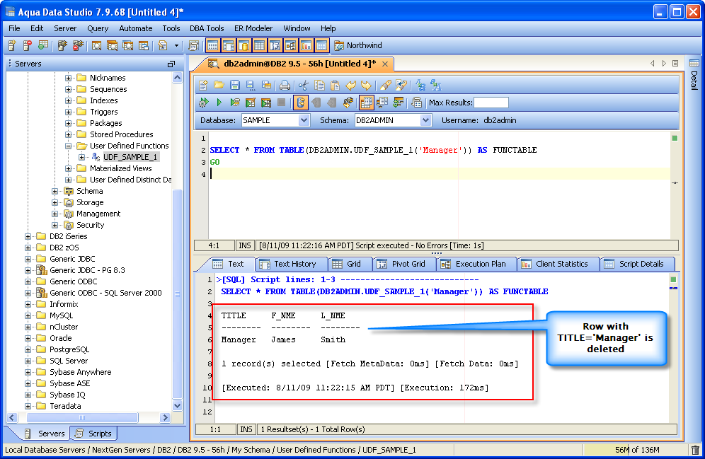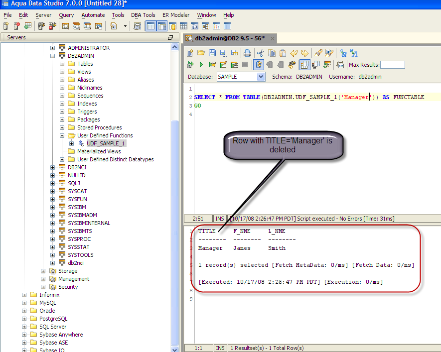 SAMPLE DB2 USER DEFINED FUNCTION This User Defined Function when executed will delete row from the table DB2ADMIN.AQUA_CUSTOMER based on the input parameter Aqua_Code. This parameter is matched to the specified TITLE column in the table. For example, if you want the UDF to delete rows from the table with TITLE=Manager, you need to specify the input parameter AQUA_CODE as 'Manager'.