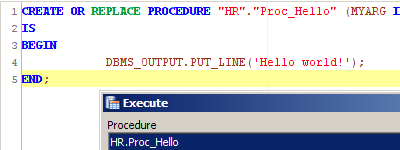 Procedure Editor When a Procedure has been opened with the Procedure Editor, the button normally associated with Executing a statement becomes associated with compiling. To the right of it is a similar button with a gear behind it for executing the procedure. Compile - Compiles the procedure, logs any compilation messages in the result grid below it. To jump to the source of a compilation error, double-click on the line in the Compilation Messages grid. Options for determining if both the header and the body are both compiled when compile is executed can be set in File -> Options -> Procedure Editor. Execute Procedure - Displays the Execute Procedure dialog to let the user specify parameters before execution. To set a value, simply click on the parameter’s Value cell and enter a value. To execute, click the Execute button or click the Cancel button to abort execution. When Packages, Functions or Procedures are Invalid, a red invalid indicator appears in the Schema Browser tree over the object's icon.