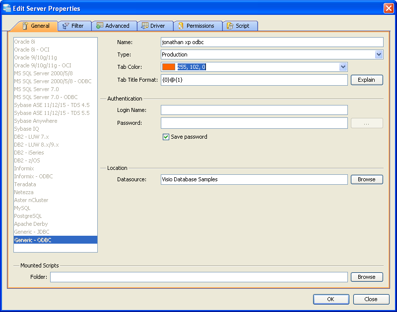 When registering a server using the Generic-ODBC connection type, make sure you specify the location of the driver which you will be using, with the correct URL and driver name. When registering a Generic-ODBC connection make sure that an ODBC datasource has already been created for use.
