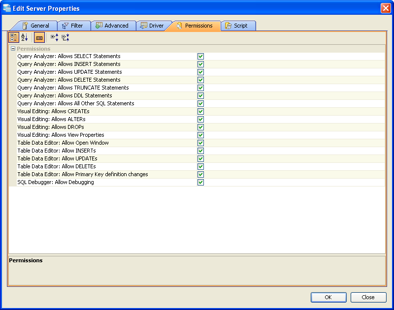 Edit the Permissions in Server Properties in Aqua Data Studio: