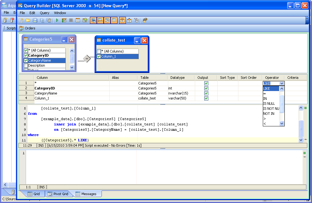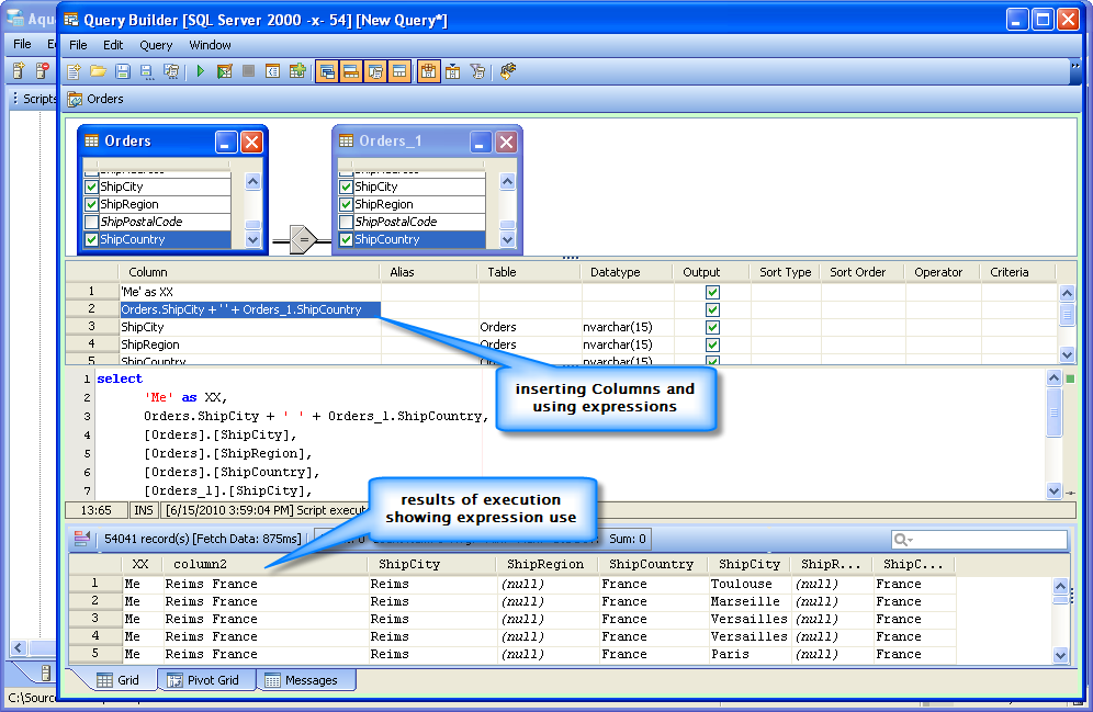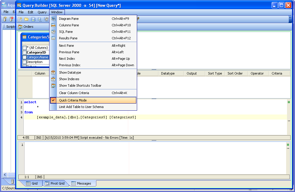 8. Executing Queries - Queries are executed by clicking the the Execute icon (Ctrl + E) or by right clicking within the Diagram Pane and selecting Execute from the menu. Executing a query within the Query Builder functions the same way as executing a query from within a Query Analyzer window. When a query is executed, its results appear in the Results Pane at the bottom of the Query Builder. Results can be viewed as Grid Results or Pivot Grid Results. Errors and messages generated during execution can be viewed in the Messages tab beneath the results pane.