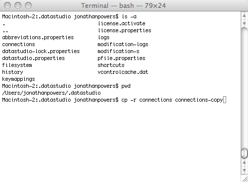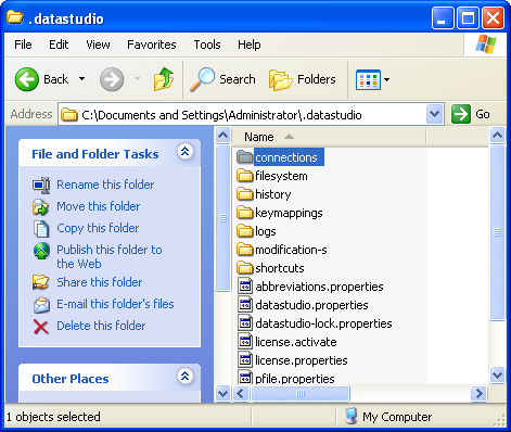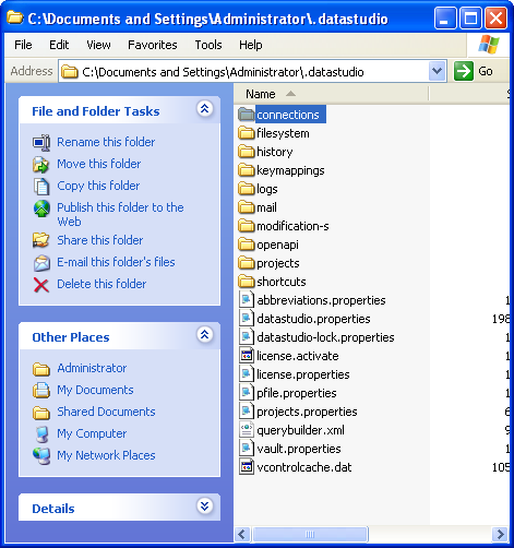 Windows XP = C:\Documents and Settings\USER_HOME\.datastudio Windows Vista and Windows 7 = C:\Users\USER_HOME\.datastudio Linux = /home/USER_HOME/.datastudio OSX = /Users/USER_HOME/.datastudio