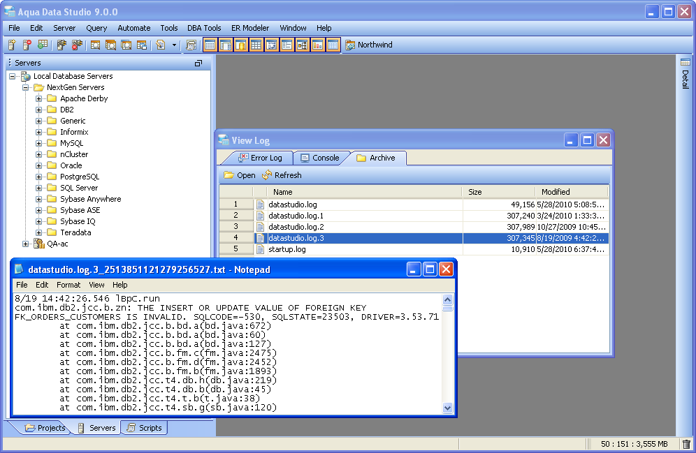 The View Log window provides three tabs for examining logs, errors and actions taken by Aqua Data Studio. This is useful for troubleshooting issues and support questions, and monitoring server connection status. The Logs and Support information can be found under the main application menu item Help