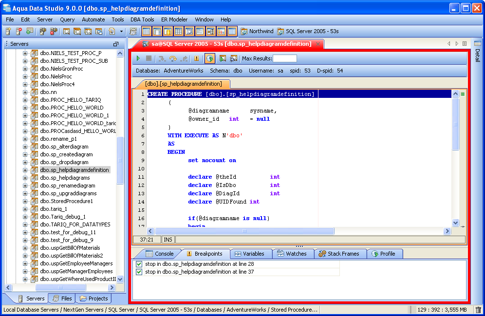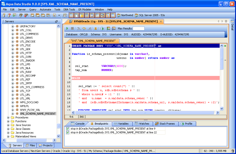 Aqua Data Studio's integrated PL/SQL Debuggers allow single-stepping, pausing, and breakpointing packages, procedures and functions to assist in troubleshooting complex queries and statements. Debuggers exist for those database vendors and versions which have application programming interfaces (APIs) to allow them. Sybase SQL Debugger The Sybase SQL Debugger has been designed to help with testing and debugging of SQL functions and procedures for Sybase ASE versions 12.5 and above. Oracle SQL Debugger The Oracle SQL Debugger has been designed to help with testing and debugging of SQL packages, functions and procedures for Oracle versions 9i and above. MS SQL Server Debugger The MS SQL Server Debugger has been designed to help with testing and debugging of SQL functions and procedures for MS SQL Server 2005 and above. The Microsoft SQL Server Debugger requires that specific connection settings configurations be made for the debugger to work appropriately. Check the Registering MS SQL Connections for Debugging section for more information. DB2 SQL Debugger The DB2 SQL Debugger has been designed to help with testing and debugging of SQL stored procedures for DB2 versions 9.0 and above. |