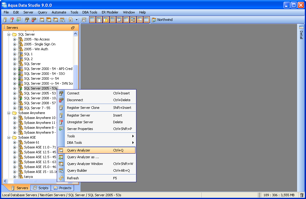 After Registering a Server in Aqua Data Studio the Query Analyzer can be launched to execute and edit SQL. There are different methods of invoking the tool, all of which launch the Query Analyzer. It is best to navigate to the server and left click to select it in the Schema Browser first, to ensure the apporpriate database is being used before beginning.