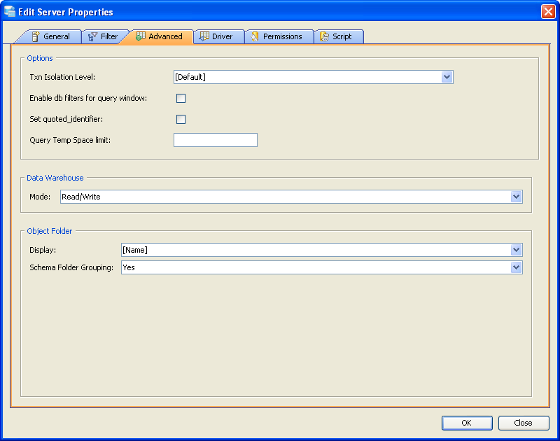 Edit the Server Properties to use Advanced Properties in Aqua Data Studio: