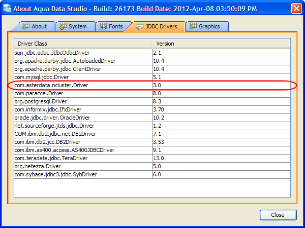 The Teradata Aster JDBC (v3.0) driver (provided with Teradata Aster) must be downloaded from the vendor and is no longer bundled within Aqua Data Studio. Copy the driver into the Aqua Data Studio/lib/drivers folder.