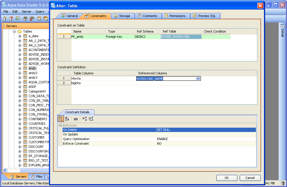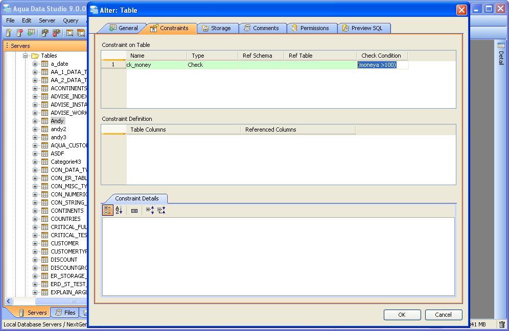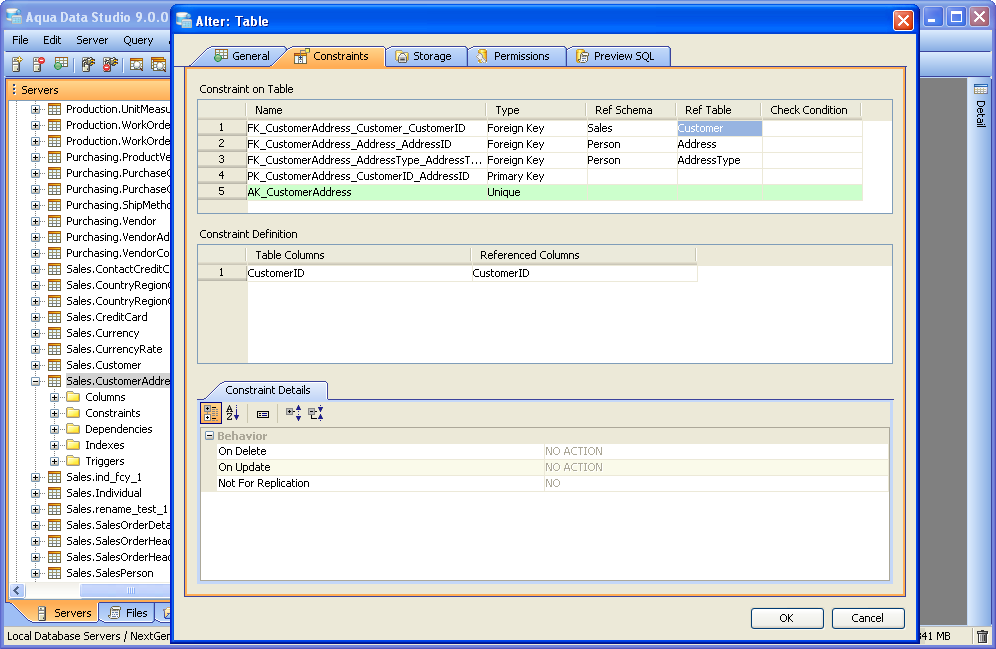 Aqua Data Studio provides visual editors for creating and editing database table Constraint objects. Constraints can be visually edited through the Create Table and Alter Table property windows, launched from a right click in the Schema Browser. Within the Alter and Create Table property windows, the Constraints Tab allows selection and editing of Table Constraints for Primary Key Constraints, Foreign Key Constraints, Unique Constraints and Check Constraints. After constraints have been set in the Constraints Tab, the Preview SQL tab displays the DDL used to generate them. When ER Models are generated from databases in the Schema Browser, constraints are visible within table entity objects. Primary Key Constraints A Primary Key is a candidate key to uniquely identify each row in a table. A table is allowed one Primary Key constraint, and a column that is part of the Primary Key constraint cannot take null values. Because Primary Key constraints ensure unique data, they are most often defined on an identity column. To create a Primary Key Constraint, enter a Primary Key Name in the name column of the Constraints table, then select Primary Key from the Type Column dropdown. In the Constraint Definition pane, select the table columns from the table that are part of the Primary key. A Primary Key Constraint is represented by a table icon with gold node when viewed in the Constraints container in the Schema Browser. Foreign Key Constraints A Foreign Key is a referential constraint between two tables. The foreign key identifies a column or a set of columns in one (referencing) table that refers to a column or set of columns in another (referenced) table. The columns in the referencing table must be the primary key or other candidate key in the referenced table. The values in one row of the referencing columns must occur in a single row in the referenced table. To create a Foreign Key Constraint, enter a Foreign Key Name in the name column of the Constraints table, then select Foreign Key from the Type Column dropdown. Select the Reference Schema and Reference Table. In the Constraint Definition pane, select the columns from the tables that are set in the Reference Table of the Foreign Key. A Foreign Key Constraint is represented by a table icon with gold node and black square when viewed in the Constraints container in the Schema Browser. Unique Constraints A Unique Constraint uniquely identifies all possible rows that exist in a table. Unique Constraints make sure that no identically copied values are entered in specific columns that do not participate in a primary key. Multiple Unique Constraints can exist on a single table. To create a Unique Constraint, enter a Unique Constraint name in the name column of the Constraints table, then select Unique Constraint from the Type Column dropdown. In the Constraint Definition pane, select the columns from the columns needed. A Unique Key Constraint is represented by a table icon with crossed node when viewed in the Constraints container in the Schema Browser. Check Constraints A Check Constraint (also known as table check constraint) is a condition that defines valid data when adding or updating an entry in a table of a relational database. Within the Constraints Tab of Create or Alter Table, the Check Condition column is where the condition is set, determining what the table considers valid data for the selected column. To create a Check Constraint, enter a Check Constraint Name in the name column of the Constraints table, then select Check Constraint from the Type Column dropdown. Enter the formula for the check in the Check Condition field. A Check Constraint is represented by a table icon with gold node and green check when viewed in the Constraints container in the Schema Browser. Sample Table with Constraint Types The screenshot labeled "Table with constraint types" shows the Alter Table dialog for a table from the AdventureWorks database in Microsoft SQL Server 2008. |