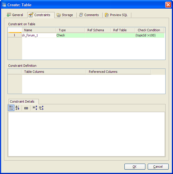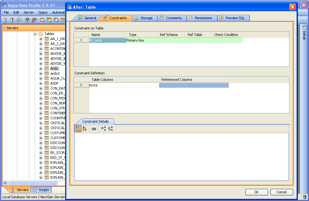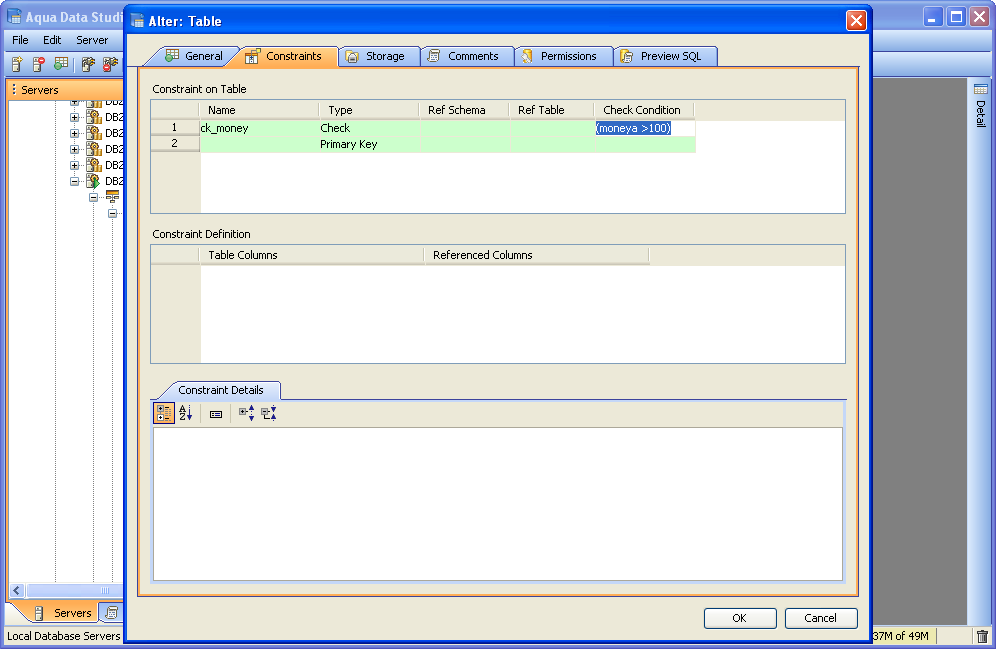 Aqua Data Studio provides visual editors for creating and editing database table Constraint objects. Constraints can be visually edited through the Create Table and Alter Table property windows, launched from a right click in the Schema Browser. Within the Alter and Create Table property windows, the Constraints Tab allows selection and editing of Table Constraints for Primary Key Constraints, Foreign Key Constraints, Unique Constraints and Check Constraints. After constraints have been set in the Constraints Tab, the Preview SQL tab displays the DDL used to generate them. When ER Models are generated from databases in the Schema Browser, constraints are visible within table entity objects. Primary Key Constraints A Primary Key is a candidate key to uniquely identify each row in a table. A table is allowed one Primary Key constraint, and a column that is part of the Primary Key constraint cannot take null values. Because Primary Key constraints ensure unique data, they are most often defined on an identity column. To create a Primary Key Constraint, enter a Primary Key Name in the name column of the Constraints table, then select Primary Key from the Type Column dropdown. In the Constraint Definition pane, select the table columns from the table that are part of the Primary key. A Primary Key Constraint is represented by a table icon with gold node when viewed in the Constraints container in the Schema Browser. Foreign Key Constraints A Foreign Key is a referential constraint between two tables. The foreign key identifies a column or a set of columns in one (referencing) table that refers to a column or set of columns in another (referenced) table. The columns in the referencing table must be the primary key or other candidate key in the referenced table. The values in one row of the referencing columns must occur in a single row in the referenced table. To create a Foreign Key Constraint, enter a Foreign Key Name in the name column of the Constraints table, then select Foreign Key from the Type Column dropdown. Select the Reference Schema and Reference Table. In the Constraint Definition pane, select the columns from the tables that are set in the Reference Table of the Foreign Key. A Foreign Key Constraint is represented by a table icon with gold node and black square when viewed in the Constraints container in the Schema Browser. Unique Constraints A Unique Constraint uniquely identifies all possible rows that exist in a table. Unique Constraints make sure that no identically copied values are entered in specific columns that do not participate in a primary key. Multiple Unique Constraints can exist on a single table. To create a Unique Constraint, enter a Unique Constraint name in the name column of the Constraints table, then select Unique Constraint from the Type Column dropdown. In the Constraint Definition pane, select the columns from the columns needed. A Unique Key Constraint is represented by a table icon with crossed node when viewed in the Constraints container in the Schema Browser. Check Constraints A Check Constraint (also known as table check constraint) is a condition that defines valid data when adding or updating an entry in a table of a relational database. Within the Constraints Tab of Create or Alter Table, the Check Condition column is where the condition is set, determining what the table considers valid data for the selected column. To create a Check Constraint, enter a Check Constraint Name in the name column of the Constraints table, then select Check Constraint from the Type Column dropdown. Enter the formula for the check in the Check Condition field. A Check Constraint is represented by a table icon with gold node and green check when viewed in the Constraints container in the Schema Browser. Sample Table with Constraint Types The screenshot labeled "Table with constraint types" shows the Alter Table dialog for a table from the AdventureWorks database in Microsoft SQL Server 2008. |