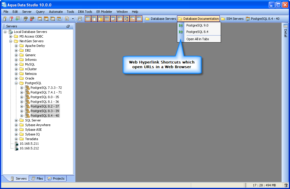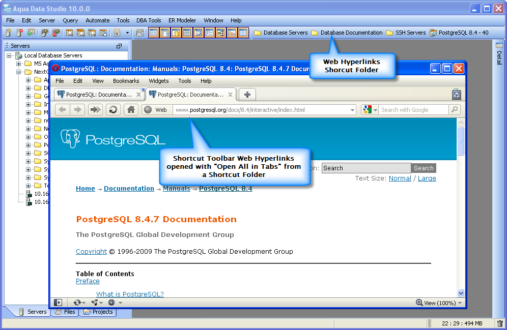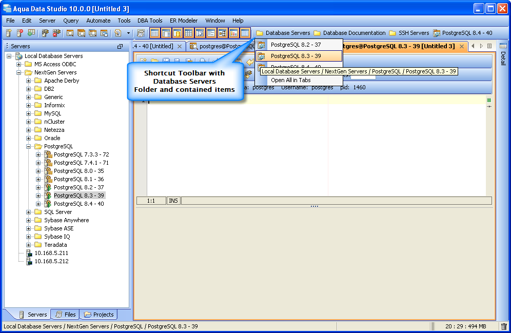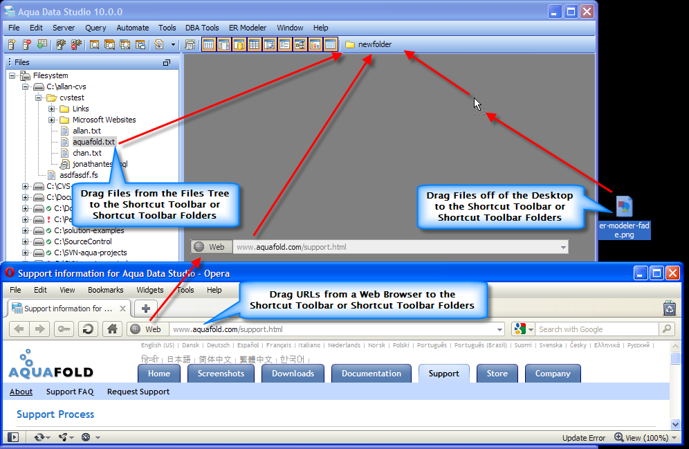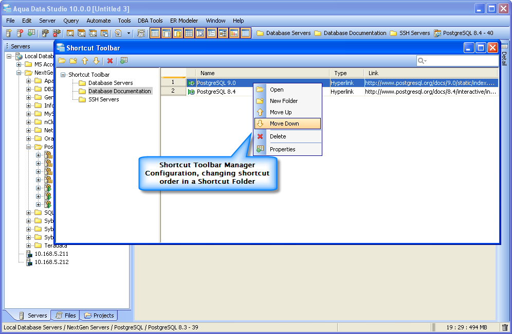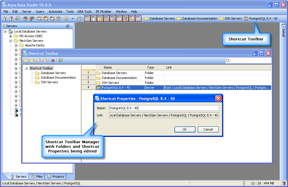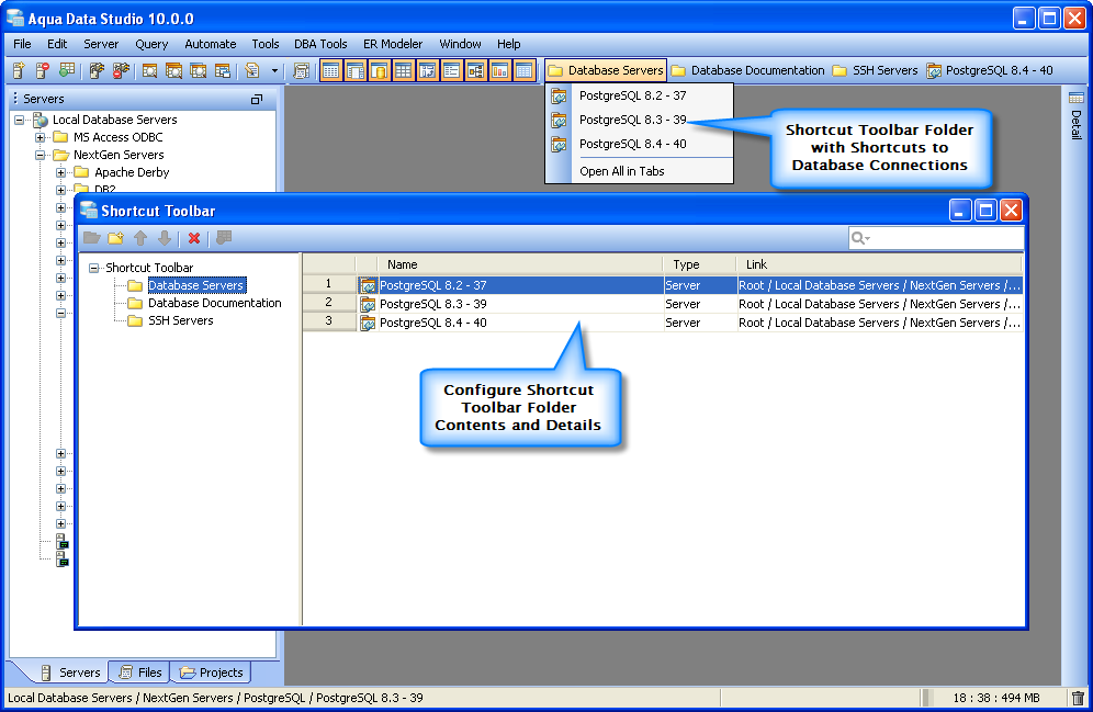 For faster access to files, servers, AquaScripts and URLs, the Aqua Data Studio IDE allows creating and grouping shortcuts into Shortcut Toolbar Folders. Organizing shortcuts into folders means an entire folder's worth of content (SSH terminals, Databases, Files, Web URLs) can be opened immediately with a single click. Items in the Shortcut Toolbar can be rearranged, deleted or have their properties altered via the Shortcut Toolbar Manager. Think of the Shortcut Toolbar as a web browser bookmark tool for Aqua Data Studio.