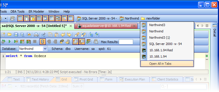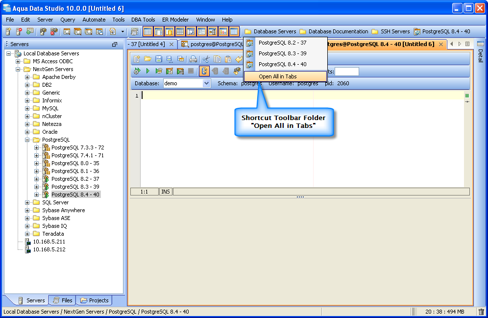 Once several shortcuts have been placed in a folder, all of a folder's shortcuts can be opened at the same time through the use of the right-click context menu "Open all in Tabs". As an example, all of a user's PostgreSQL database connections can be grouped in a single folder and opened simultaneously in separate tabs with a single click.