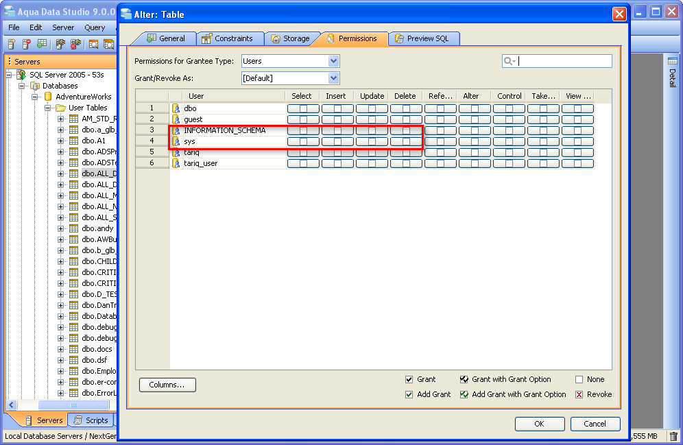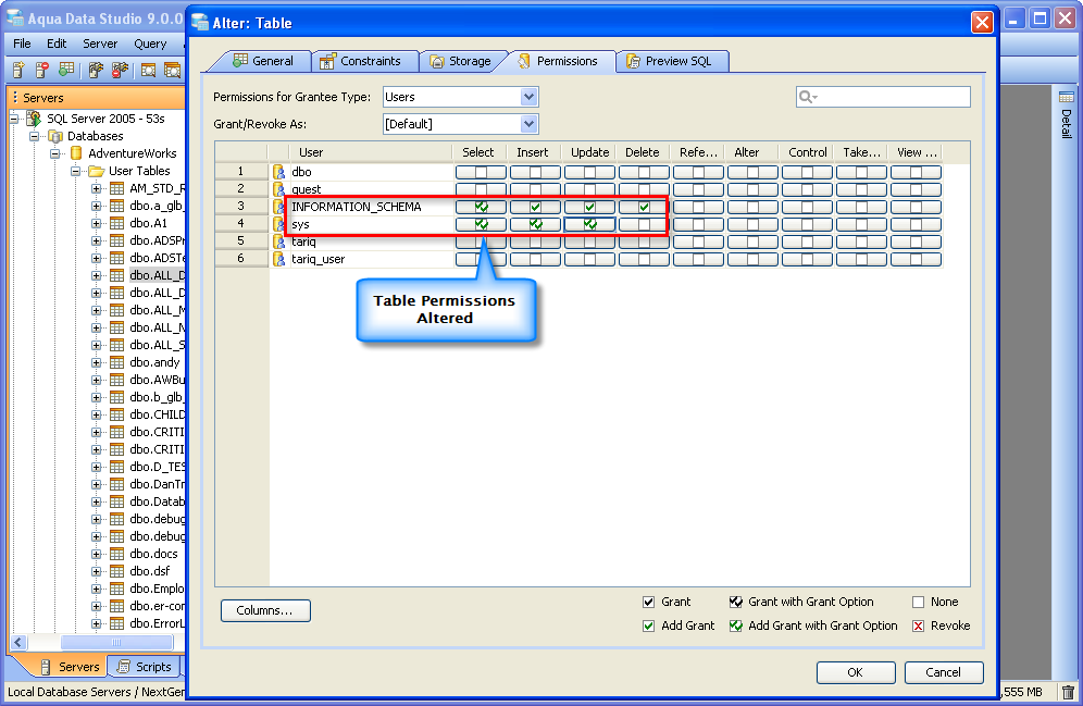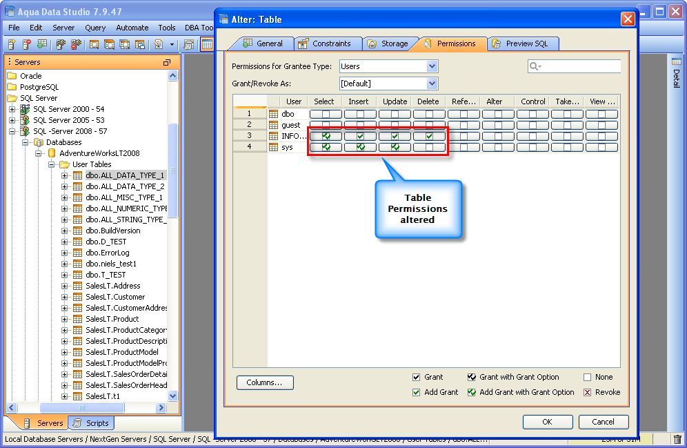 Once a table has been created, it is possible to use Aqua Data Studio's Visual Editing Tools to alter its properties. ALTER Altering tables through the GUI is also done with a right click menu on table objects in the schema browser. Right clicking on a table object opens the same popup menu as above, but to ALTER a table, select the second item in the list, "Alter Table". The resulting Alter Table window contains General, Constraints, Storage, Permissions and Preview SQL tabs across the top. Within the General tab, the table name, column names, datatypes and allow nulls can be changed. The Column information is sortable, expandable and displays more details about the selected columns. INSERT and DELETE of columns is available via right click on the Column Names within the General tab of CREATE and ALTER dialogs. The database and schema cannot be changed, and remain grayed out. Columns can be added (INSERT), deleted (DELETE) and changed (ALTER). Constraints and check conditions can be altered in the Constraints tab. Constraint properties details such as Name, Type, Ref Schema, Ref Table and Check Condition are modifiable visually. Constraint Definition Table Columns and Referenced Columns can be visually edited Storage information, just as above, can be altered in the Storage tab. The Storage tab provides details on Tablespace and table storage, its content vary depending on server vendor and version. Table Permissions (when privileges to do so have been granted to the current user in the server registration Permissions tab) can be altered and granted on the Permissions tab for column and command. Full grant options are available and all Permissions can be set by Grantee Type for Users, Groups or Roles depending on database vendor and type. Grant, Grant with Grant Option, Add Grant, Add Grant with Grant Option, and Revoke are available for SELECT, INSERT, UPDATE, DELETE across all databases. Depending on vendor supported functionality, there are other permissions which may be set such as ALTER, INDEX, References, On Commit Refresh, Query ReWrite The "Columns..." button at the bottom right of the Permissions tab, allows further permissions changes, including SELECT, INSERT, UPDATE, and References for the columns highlighted in the permissions grid within the Permissions tab. The Preview SQL tab displays the DDL used to alter the table based on the properties set within the other tabs. Below are the steps to alter a table.