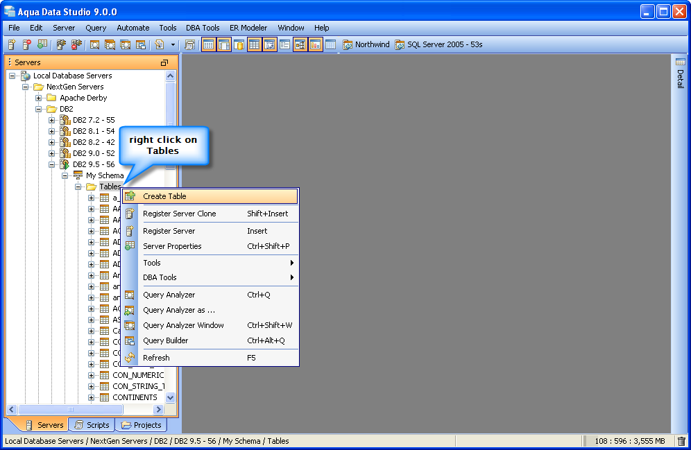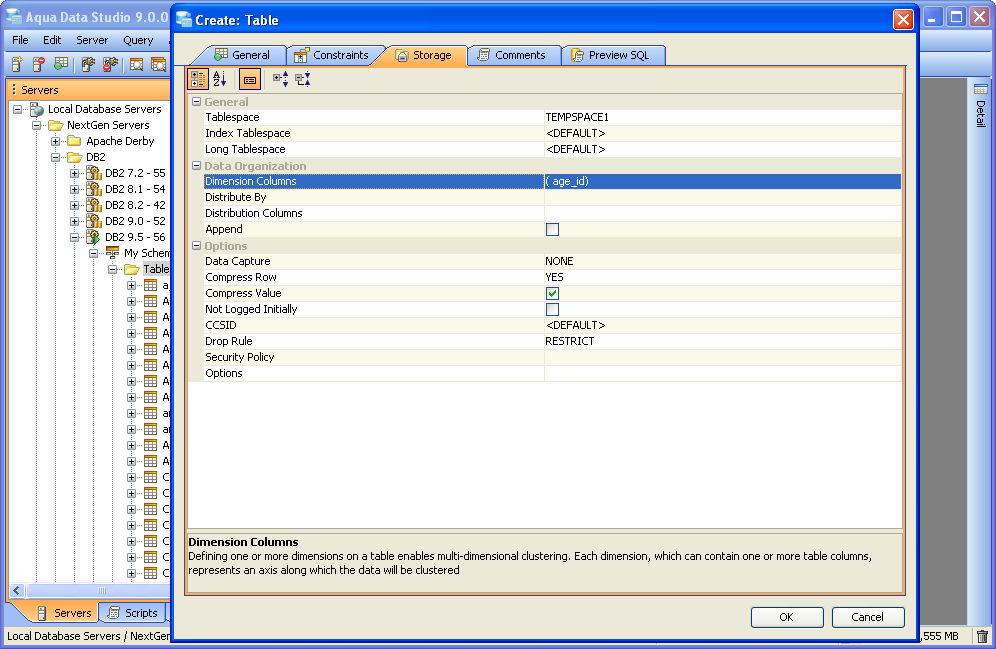 Aqua Data Studio contains GUI tools for visually editing and creating Tables. CREATE Creating tables through the GUI Tools available in the schema browser begins with opening a database server connection and expanding the tree to view the server's tables. Right clicking on the schema container for Tables generates the pop-up menu containing "Create Table" as its first item. The Create Table dialog has General, Constraints, Storage and Preview SQL tabs across the top. The General tab is where the table is named and its columns and datatypes are set. The Column information displays more details about the selected columns in the descriptin area below the column grid. INSERT and DELETE of columns is available via right click on the Column Names within the General tab of CREATE and ALTER dialogs. All of the datatypes available to the current database can be accessed with a dropdown next to the column names. The Constraints tab allows selection of columns for use in constraint creation (including Primary Key) and check conditions. Constraint properties details such as Name, Type, Ref Schema, Ref Table and Check Condition are modifiable visually. Constraint Definition Table Columns and Referenced Columns can be visually edited. For more on constraints, see the Creating Constraints page. The Storage tab provides details on Tablespace and table storage, its content vary depending on server vendor and version. The Comments tab provides space for text comments that will be stored with the table in the database. Some vendors also allow Table Column Comments, to make comments on specific columns. Where this is available, such comments will also appear ER Models containing tables with these properties. The Preview SQL tab displays the DDL used to generate the table and its properties based on the settings of the other tabs. Below are the steps used to create a table in DB2 9.5. Because other databases may not have dimensions, steps 6 and 7 may not be needed.