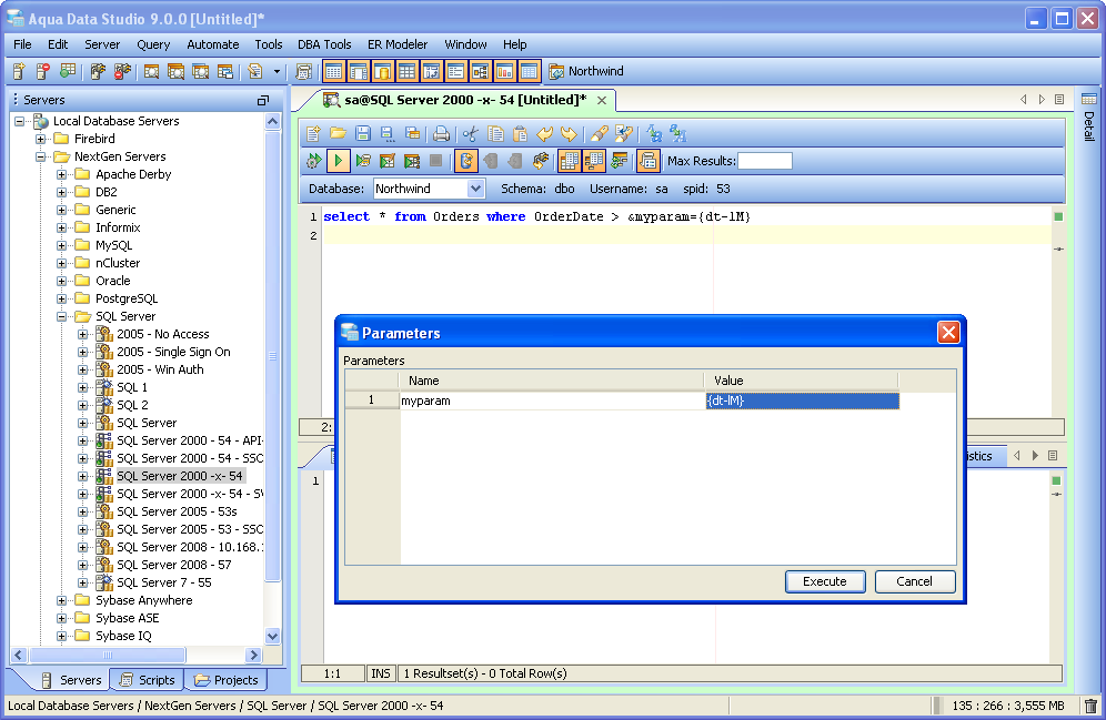 Parameters are also supported in server side comments. Client side and server side comments may be defined in File->Options->Scripts for each database. If a parameter is defined in a client side comment it will be ignored. Parameters in server side comments will be prompted and replaced. Date and time expressions in parameter values scripts. This feature allows a user to specify a default value of a parameter to be a date expression. File->Options:General:"Parameterized Scripts" has the option to specify the tags for the date and time expressions and whether to prompt