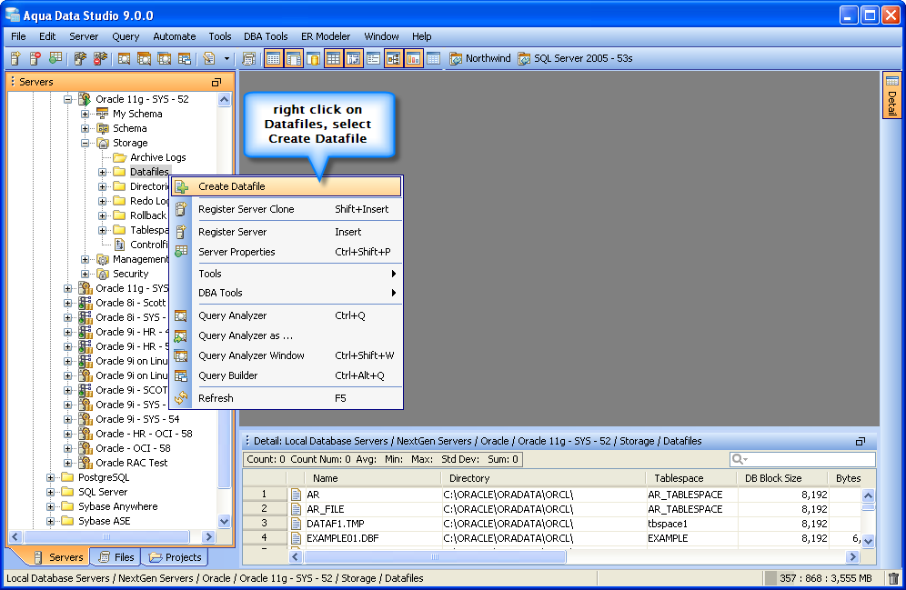 Aqua Data Studio provides visual editors for creating database Storage objects. By navigating the schema browser you may locate the Storage container (a hard drive shaped icon) underneath server connections. Storage objects vary based on database vendor and version.
