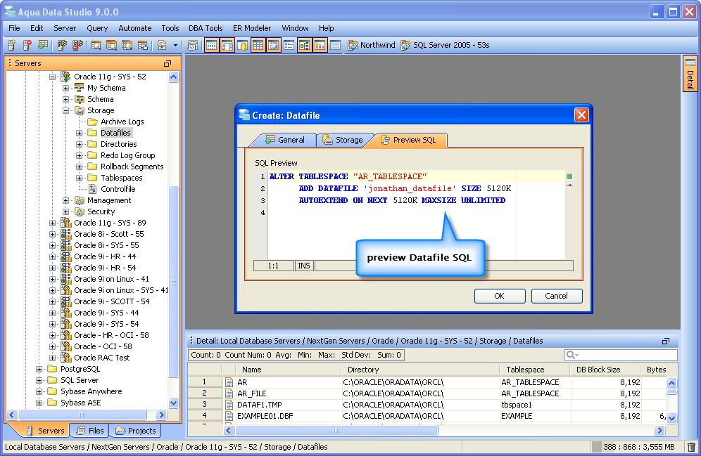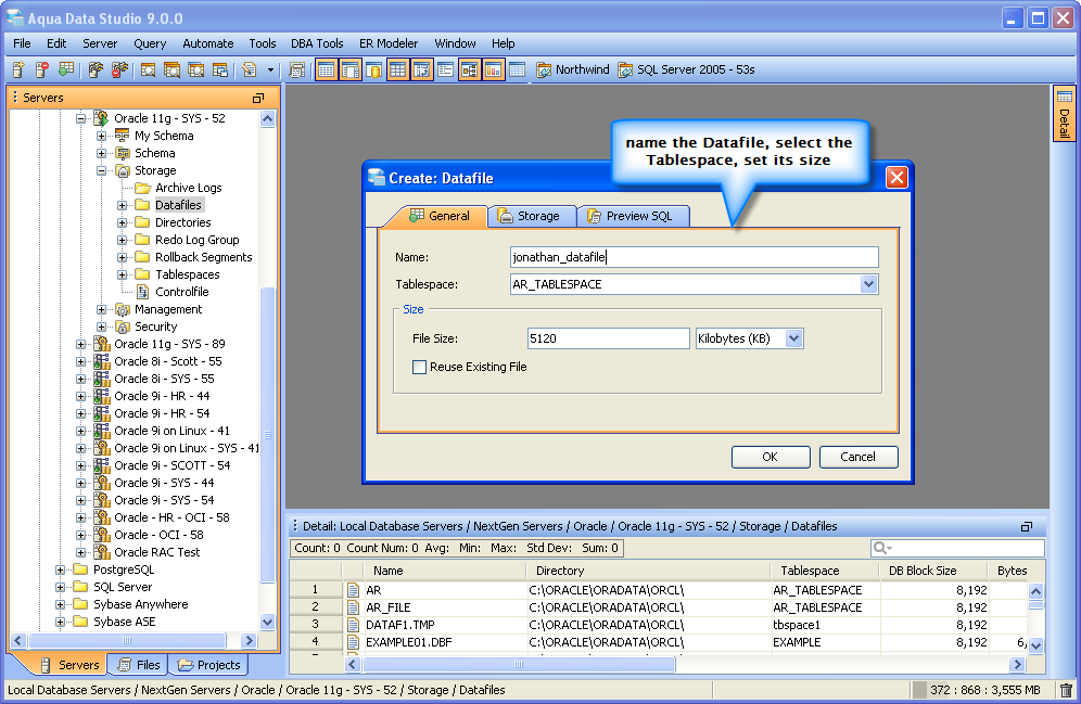 To create Oracle Datafiles, connect to an Oracle server and expand the tree to view the Storage container. Right click on Datafiles within the Storage container and select Create Datafile. Enter the Datafile name and Tablespace. Set the file size. In the Storage tab, select AUTOEXTEND and Increment, then set the Maximum Size in KB if needed. View the SQL in the Preview SQL tab. Click OK to finish.