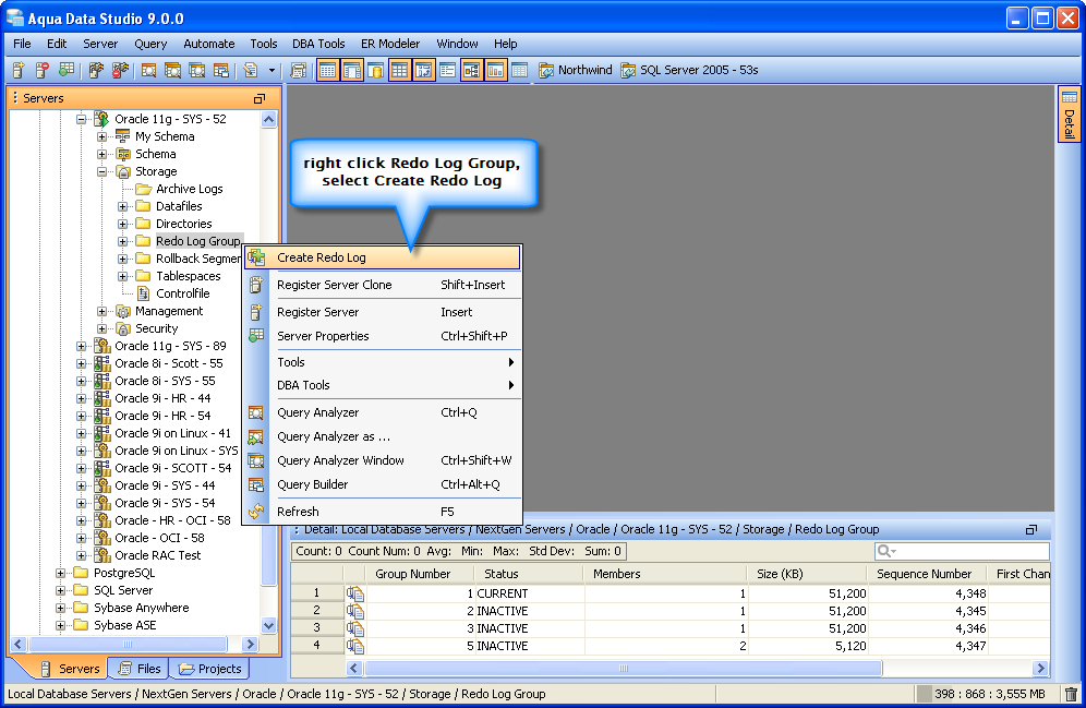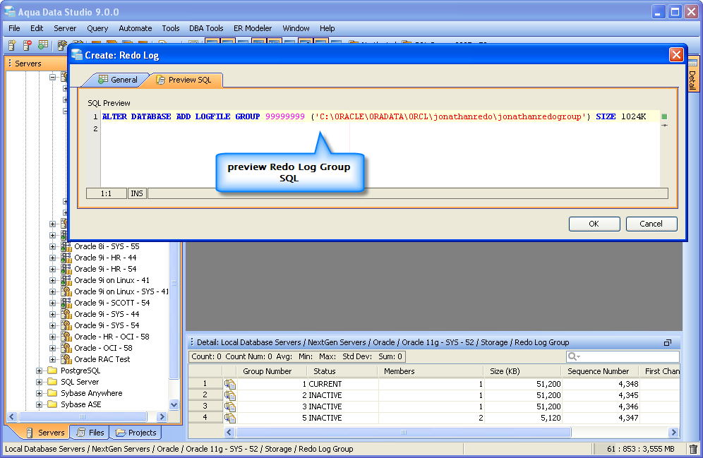 To create Oracle Redo Log Group, connect to a serverand expand the tree to view the Storage container. Right Click on Redo Log Group within the Storage container and select Create Redo Log. Enter the name for the Log Number, set the filesize and name the file and its directory. View the SQL in the Preview SQL tab. Click OK to finish.
