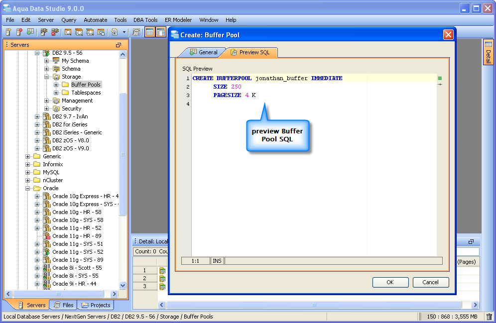 To create a DB2 Buffer Pool, expand the DB2 Storage container and right click on Buffer Pools to select Create Buffer Pool. Enter a Buffer Pool name and select a page size. Under the Buffer Pool Size section, select the size and the number of Non-blocked and Blocked Pages. Select the Block size in pages. Under the Options section choose Self Tuning or Use default Buffer Pool size. Select Create Buffer Pool on database restart or Create Buffer Pool immediately. Preview the SQL in the SQL Preview tab. Click OK to finish.