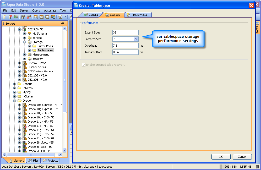 To create a DB2 Tablesplace, expand the DB2 Storage container and right click on Tablespaces to select Create Tablespace. Give the Tablespace a name, enter the path to the container and select the Type. Select the Buffer Pool to use and give the tablespace page size. Under the Storage Tab give the Extent Size, Prefetch Size and set the Overhead and Transfer rate in miliseconds. Preview the SQL in the SQL Preview tab. Click OK to finish.
