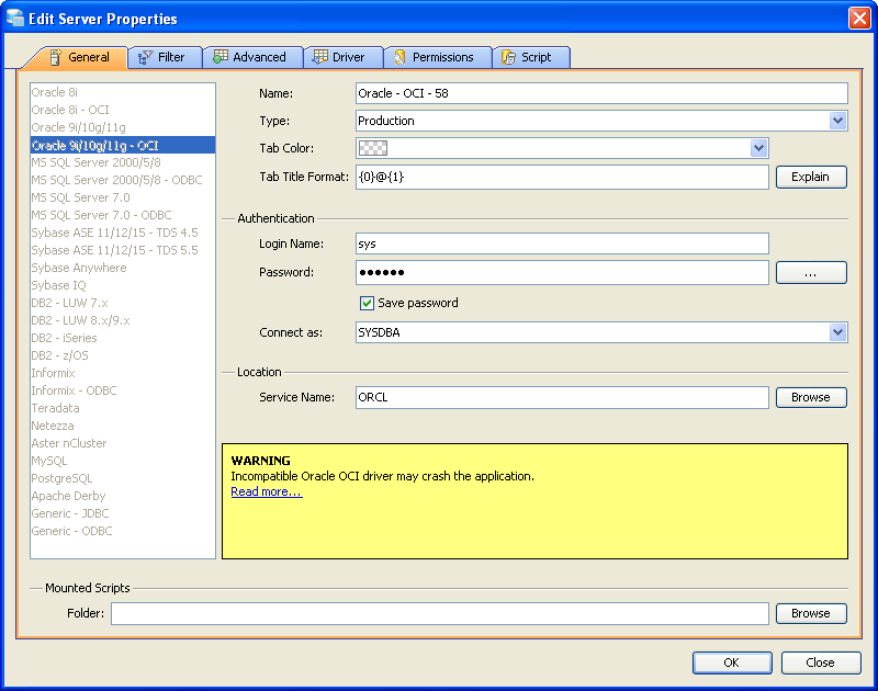 Edit Scripts in Server Properties in Aqua Data Studio: