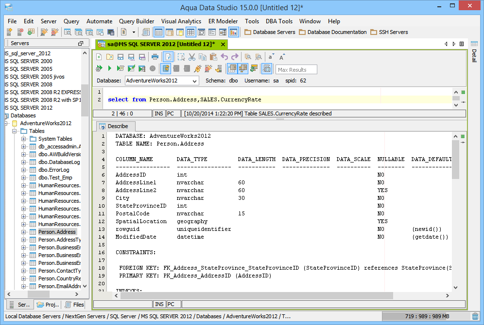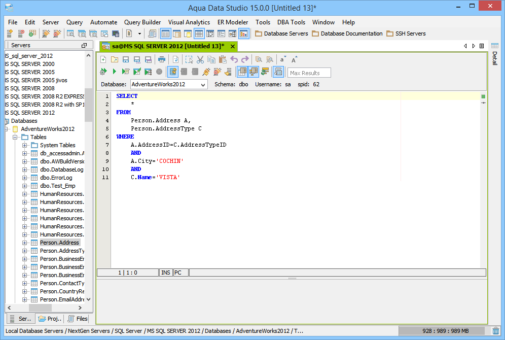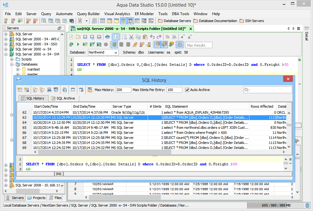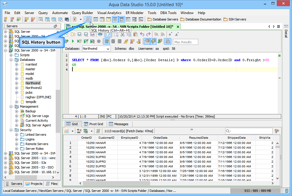 Using the Keyboard combination "CTRL+ALT+H", you may quickly view the SQL History. To view even more detailed information on the queries that Aqua Data Studio executes during its use, launch the SQL Log to record all SQL interaction.