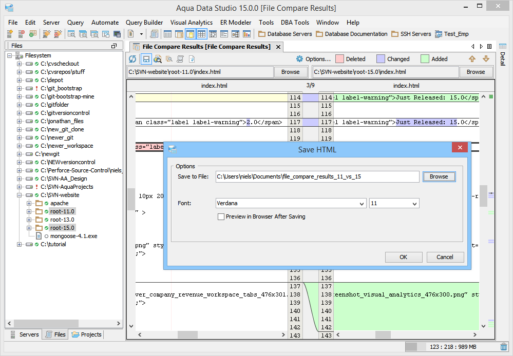 Launching the File Compare Tool The File Compare Tool provides users a method of depicting differences in the content between two text-based files. To compare two files, either multi-select individual files in the Files Browser from mounted directories, or launch the File Compare Tool from Tools Menu (Tools->Compare->File Compare) and browse to them. If the File Compare Tool is launched from the Tools Menu, it is possible to choose files that are not listed in the Files Browser, but are available to the operating system. It is also possible to drag items into the application from the operating and drop them off on the File Compare Tool file selection window. Filters to exclude files by file size, name, directory, or file extension can be selected before the comparison is run using the "Show Differences" button. The File Compare Tool keeps the last files selected when the application is restarted and the File Compare Tool is relaunched. When the comparison is being performed, it runs in a background thread so that other operations in Aqua Data Studio can be performed. Comparison Results The results of a comparison display as a split-pane with line numbering down the center and connecting splines for identifying where the deletions, changes and additions occur. Each file in a comparison takes up half of the comparison results window and each can be vertically scrolled independently of the other. At the top, between the two files above the line numbering, digits separated by a / indicate the difference selected out of total number of differences discovered (i.e. 9/27). The large up and down arrows at the top of the comparison results allow navigating through the differences one at a time. Comparisons show the character differences in a modified line with bolding and background color highlights indicate modified blocks. If they are not identical they are highlighted by default in pink (deleted), purple (changed) or green (added). The colors for the difference highlighting can be changed with the Options button at the top right of the comparison results. Annotation Bar The annotation bar provides a bird's eye view of all of the differences detected in a comparison. When differences are found, their corresponding highlight colors appear in the annotation bar on the right side of the results and can be used to quickly navigate to them. If a marker in the annotation bar is used to navigate to a particular difference by left clicking, a tick mark overlay shows which difference currently has focus. Once the comparison is complete, it can be refreshed, allowing the same comparison to be run again. It is also possible to select two new files for comparison by clicking the "Browse" buttons at the top of the comparison results without having to launch the Compare Tools Menu again. Saving Comparison Results as HTML The results of a comparison can be saved as HTML for viewing later or for sharing with others. The "Save As HTML" button at the top left of the comparison window prompts for file destination and font selection. If the "Preview in Browser" icon is clicked the user is prompted to first "Save as HTML" for launching a web browser. If the comparison has already been saved as HTML, clicking "Preview in Browser" launches a browser with the stored HTML. |