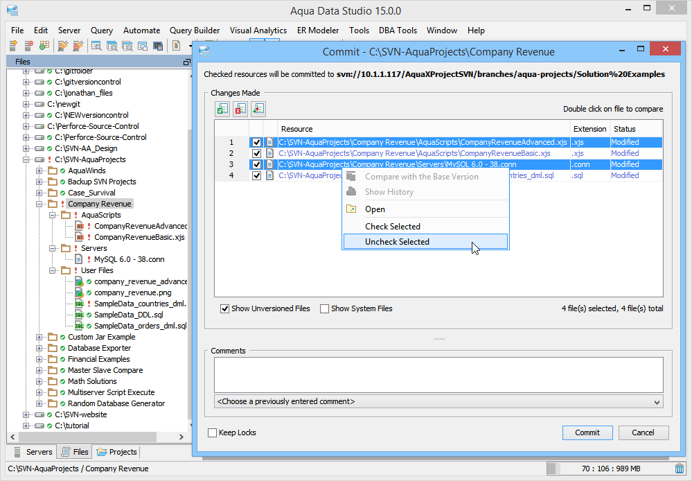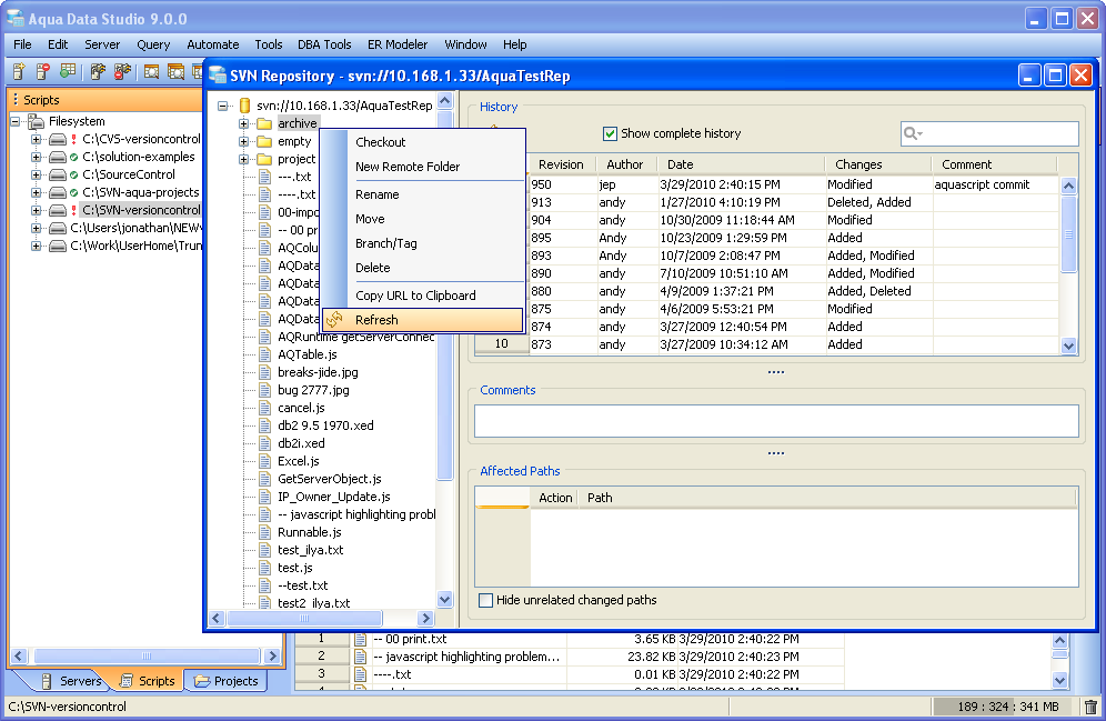 How to update a Version Control file or repository Within the scripts pane, right click on a repository, directory or file and select Update. This will retrieve the latest version from the remote repository. How to add a file to Version Control Within the scripts pane, left click on a file, files or directory to select, then right click to select "Add". This will include the selection in the repository for versioning. How to delete a file in Version Control Within the scripts pane, left click on a file, files or directory to select, then right click and navigate to "Version Control" to select "Delete". This will delete the selection from the repository. Within the Repository Browser, right clicking on an item and selecting Delete functions the same way. How to revert a file in Version Control Within the scripts pane, left click on a file, files or directory to select, then right click and navigate to "Version Control" to select "Revert". This will revert the selection in the repository. How to Show History in Version Control Within the scripts pane, left click on a file, files or directory to select, then right click and navigate to "Version Control" to select "Show History...". This will display the Version Control history of the selection in the repository. Within the Repository Browser, expanding the tree to select the file or directory you wish to view the history on, then left clicking it brings up its history in the History Table. The history displayed in the Repository Browser and the history displayed when selecting Version Control->Show History work similarly. Show History Dialog (window) Right clicking on a versioned item in the Files Browser gives direct access to show the history of that item. The resulting Show History dialog provides a list of all of the version control actions on a file or directory, and the revision's contained files. By default, the Show History Dialog only shows the most recent changes. If the "Show Complete History" option is enabled, all of the actions taken since the creation of the repository will be listed. Each action can be inspected in a table with columns for Revision, Author, Date, Changes and Comments. Two items in this history can be selected and compared to show the differences in actions and content over time. An item in the history can also be selected to "show changes" in the file as a comparison to its previous revision. Once a revision is identified within the History, right clicking on it also allows a checkout of that specific revision or a revert to that specific revision. At the bottom of the Show History is an area displaying affected paths of a revision, with an option for hiding unrelated changed paths. The Subversion (SVN) Repository Browser is a convenient way to view all of the contents of a repository, even when no working copies have been mounted locally. While the Repository Browser shows details on item history, it does not show the status of local working versions. It is more for exploring the remote repository and its contents than managing the local versions of files. To Launch the Repository Browser, right click on an item in the Files Browser and select Version Control -> Browse Repository. A window appears with the url to the repository in its title. An expandable tree view appears on the left and a history for the selected items in the tree appears on the right. The Subversion (SVN) Repository Browser points to the repository root when launched and offers an in-depth, explorable view of all of the files in a repository without requiring a local version of its content. The repository is displayed as a tree where action can be taken on individual items, or they can simply be viewed. The History table within the Repository Browser allows opening and comparing of individual items by way of a popup menu. Tree content is obtained with a background thread so that Aqua Data Studio’s other tools can be used while information from the repository is being retrieved. In the Affected Paths display, unrelated changed paths can be hidden. Inside the tree, right clicking on items allows checkout, new remote folder, rename, move, branch, delete, copy url and refresh. The Browse Repository menu item invokes the browser, pointing to the repository root, showing a tree, history table, and a "show complete history" checkbox for viewing the complete history of items in the repository. Clicking on item in the history table can also shows affected paths when it is enabled. Repository Browser Tree popup menu Right clicking within the repository browser launches a menu with checkout, new remote folder, rename, move, branch, delete, copy url, and refresh menu options. Repository Browser History Table and popup menu The Repository Browser History contains much of the functionality of the Show History Dialog mentioned above. Clicking on items within the Repository Browser History Table brings up menu options for show changes, compare, open, compare with revision, compare repository revisions. The history content is obtained in a background thread, allowing Aqua Data Studio's other operations to continue uninterrupted. Additional Subversion features