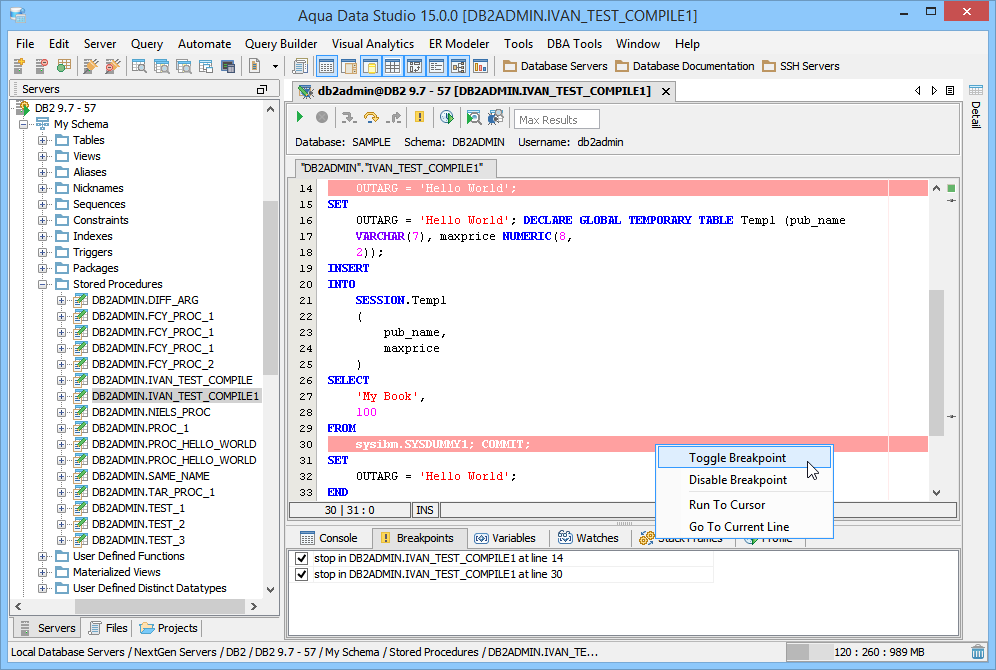 The DB2 SQL Debugger has been designed to help with testing and debugging of SQL stored procedures for DB2 versions 9.0 and above. Launching the DB2 SQL Debugger The DB2 Debugger is launched through a right click in the Schema Browser on Stored Procedures and selecting Debug in Procedure Debugger from the popup menu. More than one debugger can be open at once, with each object to be debugged opened in a separate tab. Debugger Workspace The debugger displays a slightly modified version of the Query Analyzer Toolbar containing debugger specific menus and buttons. Along the top of the debugger are the Execute, Stop, Step Into, Step Over, Step Return, Toggle Breakpoint, Turn On Profiling, Target Query Window, Debugger Query Window buttons. Next to the buttons is the Display Max Results input field. Beneath the buttons is the connection information, username and SID information. The procedure displays in the debugging window, within which breakpoints can be added by right clicking and selecting "Toggle Breakpoint" from the popup menu. When this window has focus, and a line has been clicked, it is also possible to select "Run to Cursor," to run the debugger up to that line in the procedure. From the same popup menu, "Go to Current Line" brings the cursor to the current line, which is very useful when debugging multiple lengthy procedures. Below the debugger window are tabs for Console, Breakpoints, Variables, Watches, Stack Frames and Profile. The Console tab displays any errors or messages generated as debugging progresses. The Breakpoints tab indicates the lines of the procedure where breakpoints are set and allows them to stop execution or not. The Variables tab lists any variables by name, their value and type. The Watches tab allows selecting specific variables to be observed as they change, reducing from a possible list of hundreds to a select group. The Stack Frames tab lists the local variables of the functions, and the arguments to them. The Profile tab lists commonly used terms or values a user works with on a regular basis in the debugging process. Once execution of a procedure has begun through the use of the Start button at the top of the debugger window, the bottom left of the window is occupied by the Text, Text History, Grid, and Pivot Grid Results tabs. This area functions just as the Query Analyzer window does, revealing the results of procedures at each breakpoint or execution cursor. The DB2 SQL Debugger features include: