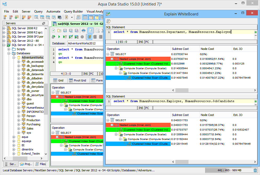 Execution Plan - Execution Plans display detailed statistics on the execution cost of the statement or script. A color coded visual execution plan will be generated for each query executed in the Query Analyzer. Subtree Cost, Node Cost, CPU cost, Estimated Input/Output, Estimated Rows, Executes, Argument, Type, Average Row Size, Defined Values, Output List, Warnings, Parallel, Estimated Executions, Physical Operations, Logical Operations and Statement Text are presented in a table. The contents of an Execution Plan can be added to a Visual Explain Whiteboard so that comparisons can be made to query variations. Execution Plans are extremely useful in query tuning for speed optimization. Read more about Execution Plans and the Visual Explain Whiteboard here. |