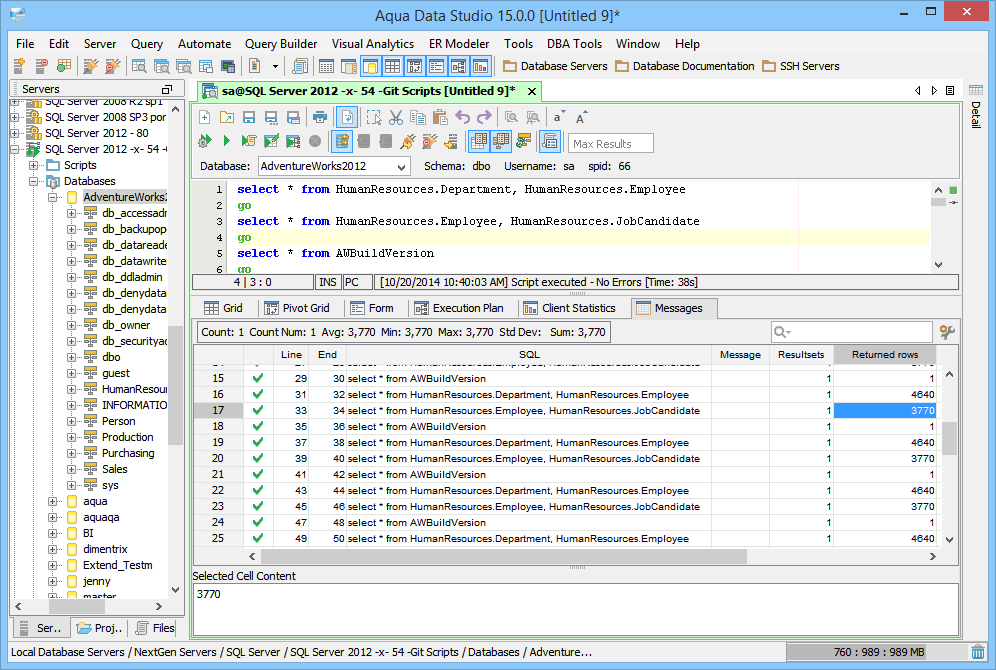 Client Statistics - Displays detailed statistics on the execution of the statement or script. |