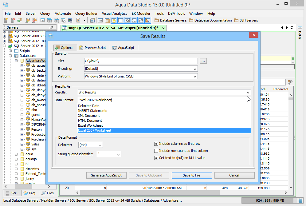 With the Query Analyzer's Save Results feature, results of a statement execution can be saved to a variety of different file formats or copied to the clipboard for reuse or pasting elsewhere. The Save Results dialog can be launched by right clicking within a Query Results window and selecting "Save Results" from the popup menu. It can also be launched by clicking the Save Results icon, a floppy disk with a grid overlay, in the Query Analyzer Toolbar to the left of the Print icon. The Save Results allows a wide variety of formats including, Delimited Data, INSERT statements, XML, HTML, and Excel worksheets. Selected Results can also be sent directly to the clipboard by clicking the "Save To Clipboard" button in the Save Results dialog. (Data Format for Excel does not save to clipboard). For cases where large results sets (100,000 rows or more) are being dealt with, it is best to use Save Results instead of Save To Clipboard. Copying a large result set to the clipboard dramatically increases the RAM in use. Save Results streams data directly to disk and it is highly recommended that "Save Results" or Export be used instead of copying large amounts of data from a Grid Result. Using the Operating System's clipboard for a large copy effectively doubles the amount of RAM in use because the Grid Result is already holding those items in memory. Saving to a file uses much less RAM, as a file is streamed to disk instead of being kept whole in memory. Below are the steps for Save Results and a list of all of its options and settings.