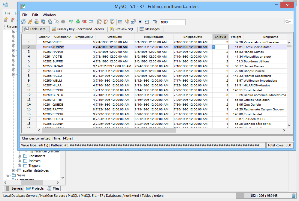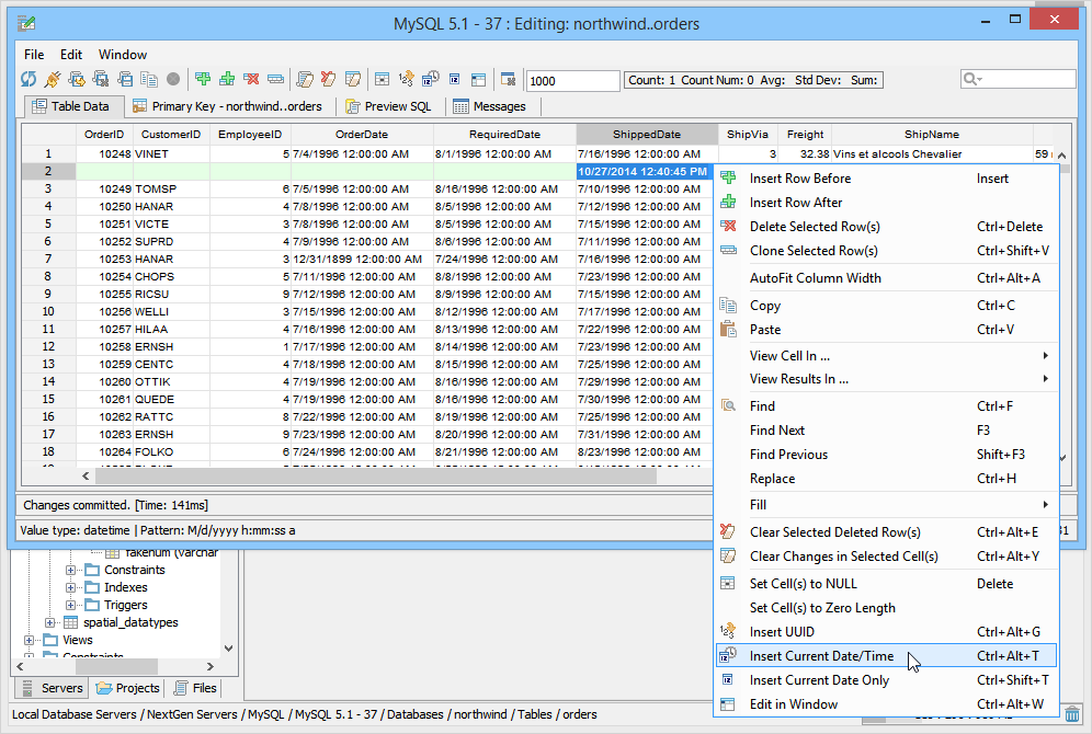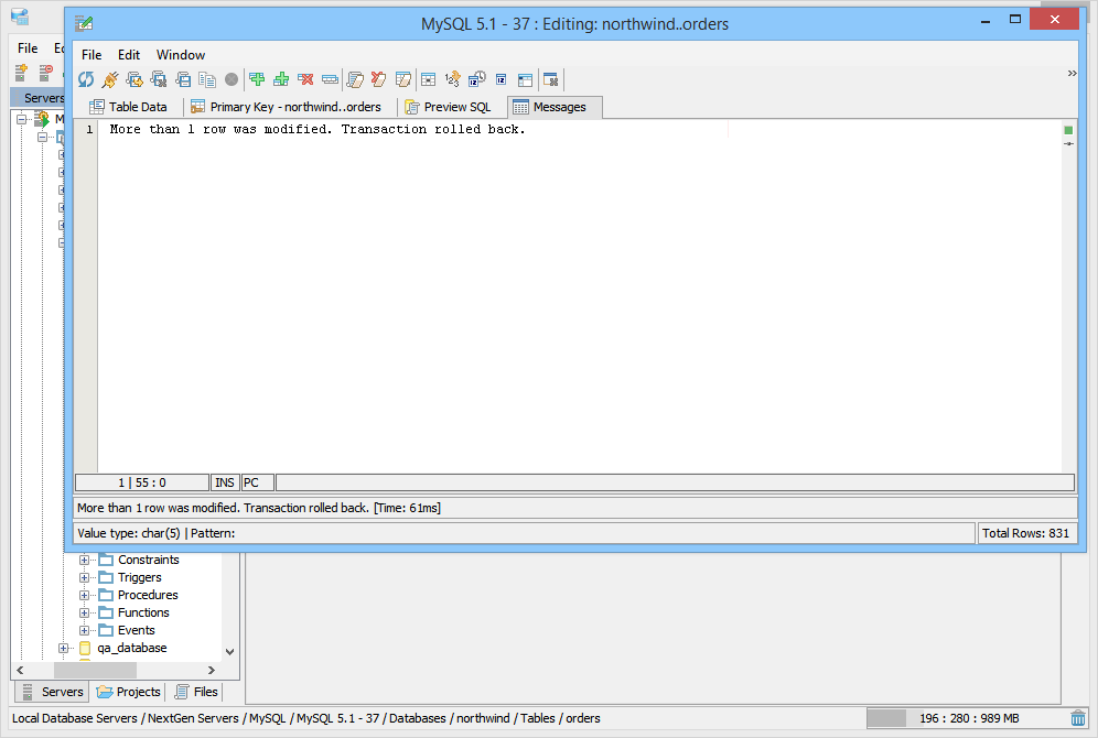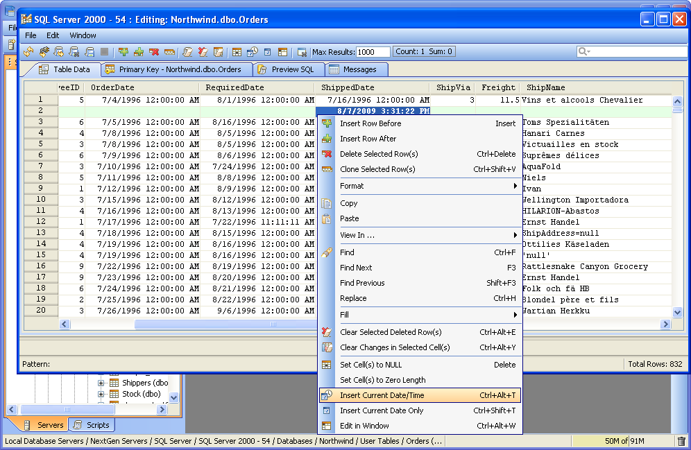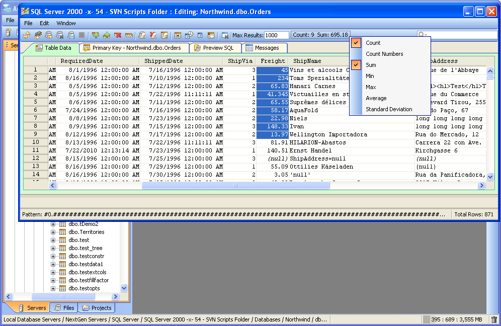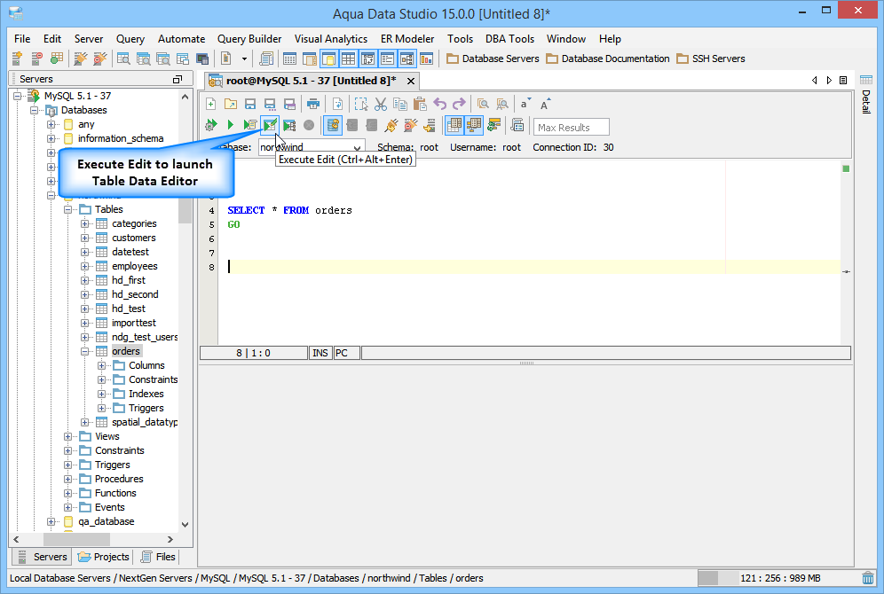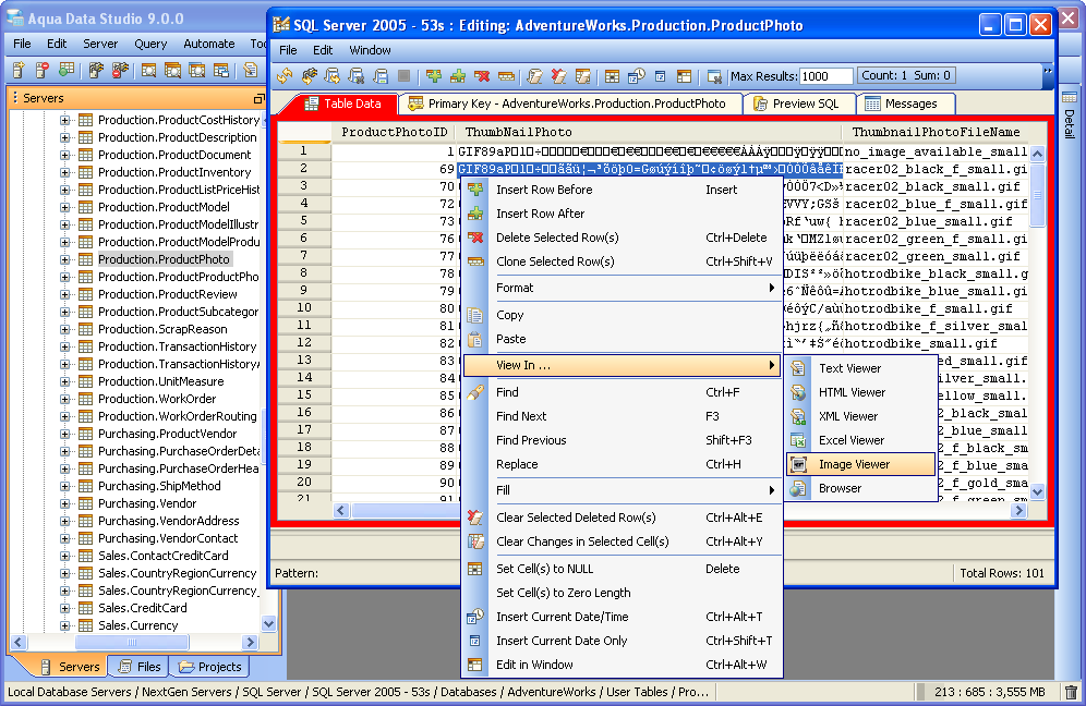 Aqua Data Studio provides a Table Data Editor which allows a user to graphically edit the resultset of an executed query on a table, including its data and rows. The editable result set is displayed in an Excel like grid. To activate a table editor you must either right click on a table in the Schema Browser and select "Edit Table Data (Top 1000)" or write a table SELECT statement and use the "Execute Edit" button. This will execute the query and return the resultset in a new Table Editor window. From this window a user may edit and save the contents of the resultset. The editor uses the primary key or any unique constraint to identify the row in the result which it will generate UPDATE statements for. If your resultset doesn’t have a primary key or unique constraint, you will be prompted to define a primary key in the primary key tab. A check mark indicates which column(s) participate in the primary key. There is an option within File->Options->Permissions to allow Primary Key Definition Changes. Table Data Editor Workspace Like the other tools of Aqua Data Studio, the Table Data Editor is part of the Application Docking Framework. The window for the Table Data Editor can remain open as other tools in Aqua Data Studio are used. The Table Data Editor's menus and icons are taken directly from the Main Application Toolbar. Their functionality for refreshing and reconnecting to database servers has been included to make it easier to reconnect and refresh table data without having to access the Main Application Menus and Toolbar. At the top are the File, Edit and Window menus. Below are Toolbar icons for Refresh, Reconnect, Save and Refresh, Save and Close, Save Script ("Save Script" stores the chosen directory path and uses it for subsequent save operations as a default directory for easier navigation), Stop, Add Row Above, Add Row Below, Clone Selected Row(s), Clear All Changes, Clear Selected Deleted Rows, Clear Changes in Selected Cells, Set Cells to Null, INSERT Current Date and Time, INSERT Current Date Only, Edit in Window, Close Window, Max Results, Aggregate Functions (when enabled) and Quick Filter. Below the Toolbar Icons are the tabs for Table Data, Primary Key, Preview SQL and Messages. The Window menu can be used to cycle through tabs when so many exist it is difficult know which one was focus via Window->Next Tab; Window->Previous Tab; Window->Focus Max Results. The layout of the data within the Table Data tab functions similar to a spreadsheet appliction, with the ability to insert rows and cells where desired via Find and Replace when needed. Most of the work done in the Table Data Editor occurs in the Table Data tab, which displays the data for the table(s) from the select statement used in the Execute Edit mentioned earlier. Row color and bolding assist in displaying recent changes and nulls in the data, and appear in the Table Data Editor modification logs (when enabled in File->Options->Table Editor->Modification Logs). A box appears around the content inside of a selected cell to identify content length where blank spaces may appear before text, but not be visible. Table Columns, must be added or removed from tables via context menus with right clicks in the Schema Browser or through the Query Analyzer by way of database commands. Using Edit->Format: AutoFit Column Width, cells can be highlighted and resized automatically using the menu, a key shortcut, or a double-click on the right border of the column header. This option can be configured from the dropdown menu. The Primary Key tab displays a list of all of the columns relating to the tables in the query used to launch the Table Data Editor via the Execute Edit command from the Query Analyzer. If more than one table was used in the query, a dialog appears to choose the primary keys and an additional Primary Key tab will display for each table with schema information in the tab title. The Preview SQL tab displays the DDL used to perform the edits made within the Table Data Editor with appropriate Syntax highlighting. The Messages tab displays any warnings or messages during table data modification. At the bottom of the Table Data Editor window are the Preview Panel (when enabled) and Status Bar. The Preview Panel creates a cell's preview in a split panel to allow the user to preview the currently selected value in the grid. This helps the display the full value of a narrow cell, including long string values or CLOB values. The Status Bar contains Pattern information to show the data type and range of selected cells at the bottom left, and Total Rows of the table at bottom right. After the changes are saved and the table is refreshed (Save and Refresh), the cursor selects the first cell of the selected row before save. When closing a modified window the application will prompt for "Save," "Discard" and "Cancel." Visual Editing The Table Data Editor allows you to add, edit and delete rows and changes in the editor are color coded so that you may see your changes before commiting them. Inserted/Modified/Deleted rows have light blue cell background. Modified cells have a slightly darker color for the text so it allows the user to see spaces. Cells in Inserted Rows also have the background color of the text shaded to identify invisible characters.