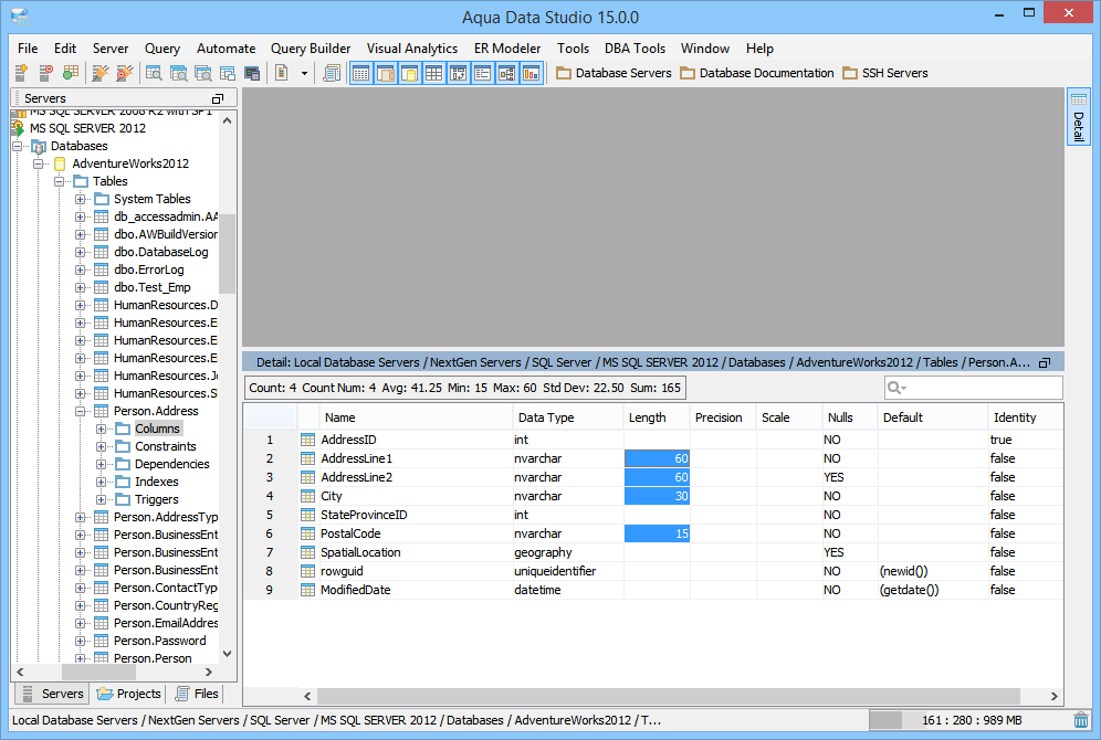 Aggregate Functions are available, which display statistical information on values in selected cells within the Detail View. This functions identically to the Aggregate Functions available in the Grid Results.