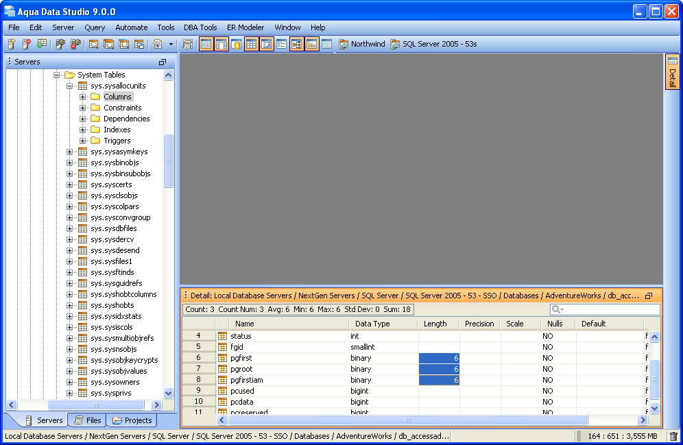 The button on the right hand side of the Query Window marked "Detail" turns on and off the Detail View. Content displayed within the Detail View varies based on the database object, vendor and version selected. Files within the Files Browser display modifcation date and time when their containing directory is selected. When several objects are selected, their details can be viewed. This makes it convenient to check offline or online status of several databases at the same time, or see the modification dates on files within a directory.