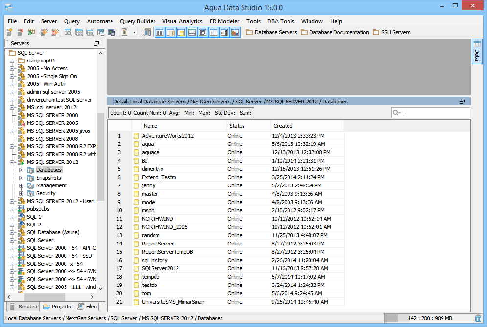 A quick method of checking the status of a database is to click on a registered database server with the Detail View enabled.