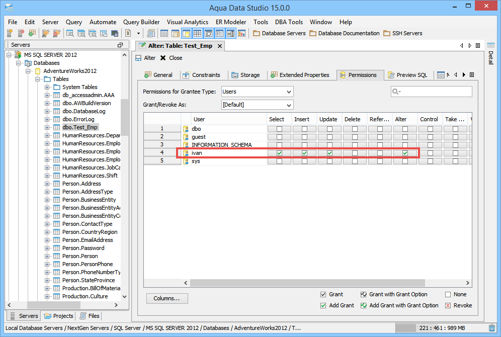 Once a table has been created, it is possible to use Aqua Data Studio's Visual Editing Tools to alter its properties. ALTER Altering tables through the GUI is also done with a right click menu on table objects in the schema browser. Right clicking on a table object opens the same popup menu as above, but to ALTER a table, select the second item in the list, "Alter Table". The resulting Alter Table window contains General, Constraints, Storage, Permissions and Preview SQL tabs across the top. Within the General tab, the table name, column names, datatypes and allow nulls can be changed. The Column information is sortable, expandable and displays more details about the selected columns. INSERT and DELETE of columns is available via right click on the Column Names within the General tab of CREATE and ALTER dialogs. The database and schema cannot be changed, and remain grayed out. Columns can be added (INSERT), deleted (DELETE) and changed (ALTER). Constraints and check conditions can be altered in the Constraints tab. Constraint properties details such as Name, Type, Ref Schema, Ref Table and Check Condition are modifiable visually. Constraint Definition Table Columns and Referenced Columns can be visually edited Storage information, just as above, can be altered in the Storage tab. The Storage tab provides details on Tablespace and table storage, its content vary depending on server vendor and version. Table Permissions (when privileges to do so have been granted to the current user in the server registration Permissions tab) can be altered and granted on the Permissions tab for column and command. Full grant options are available and all Permissions can be set by Grantee Type for Users, Groups or Roles depending on database vendor and type. Grant, Grant with Grant Option, Add Grant, Add Grant with Grant Option, and Revoke are available for SELECT, INSERT, UPDATE, DELETE across all databases. Depending on vendor supported functionality, there are other permissions which may be set such as ALTER, INDEX, References, On Commit Refresh, Query ReWrite The "Columns..." button at the bottom right of the Permissions tab, allows further permissions changes, including SELECT, INSERT, UPDATE, and References for the columns highlighted in the permissions grid within the Permissions tab. The Preview SQL tab displays the DDL used to alter the table based on the properties set within the other tabs. Below are the steps to alter a table.