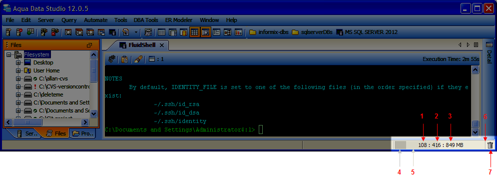 You can quickly view how much of your JVM’s RAM is being used by Aqua Data Studio by looking at the bottom right corner of the Main Application window in the Memory Statistics Display, next to the Garbage Collection icon which is a tiny trashcan. If you find you're running low on memory, you can increase the memory allocated to Aqua Data Studio. Instructions below.