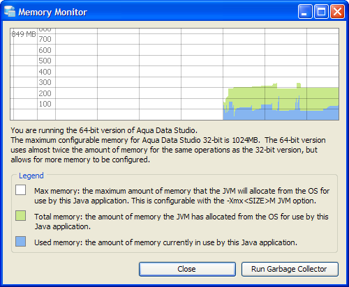 Aqua Data Studio includes a Memory Monitor which displays a live chart of the application's memory usage, the current maximum memory allocated to the application and an explanation of Max Memory, Total Memory and Used Memory. To launch the Memory Monitor, double click on the memory usage statistics in the Memory Statistics display at the bottom right corner of the application window. The resulting window indicates whether the 32bit or 64bit version of the application is in use.